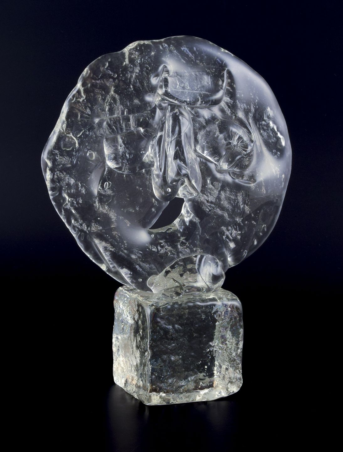 Stor skulptur af mandeansigt i klart kunstglas på sokkel.