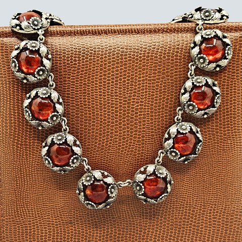 N. E. From; Halscollier i sterling sølv med rav prydet med blomster og blade.