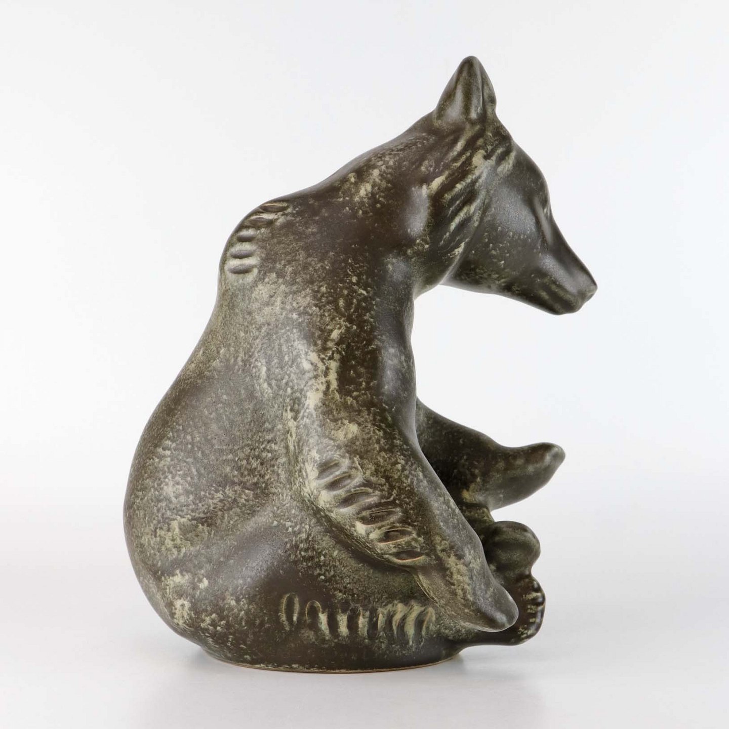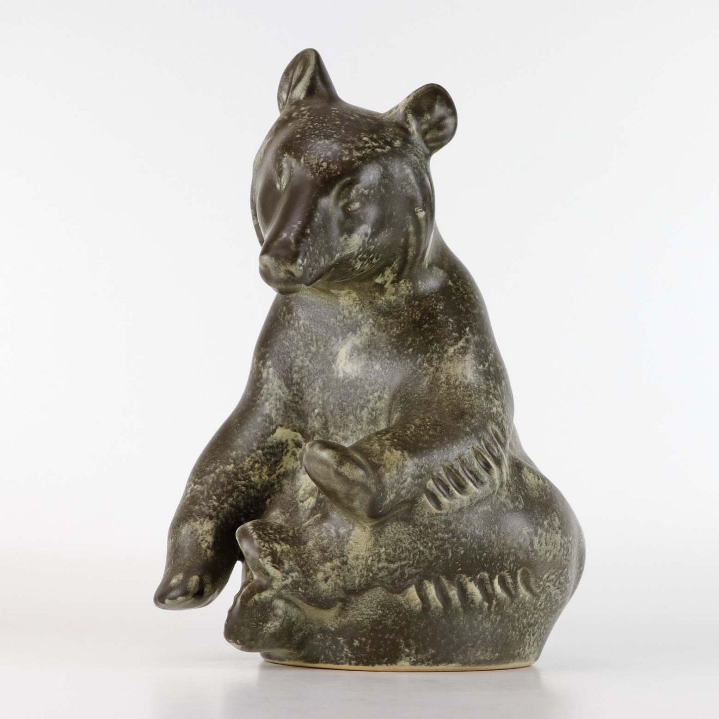 Figur i keramik med brunmeleret glasur med motiv af siddende bjørn. Nr. 22