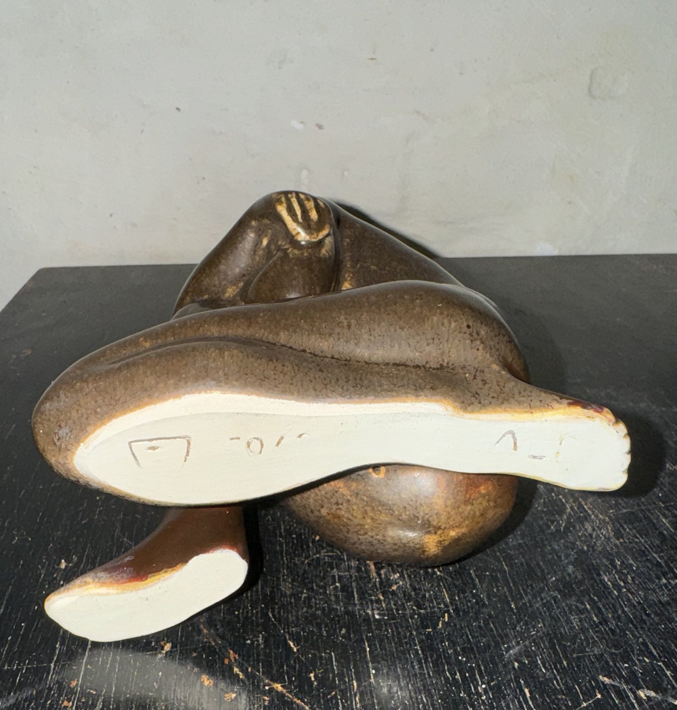 Michael Andersen & Søn: Brun harepels glaseret figur af nøgen kvinde, der poserer siddende. Fremstår i god stand. Fabeiksmlrket på bunden. H.
