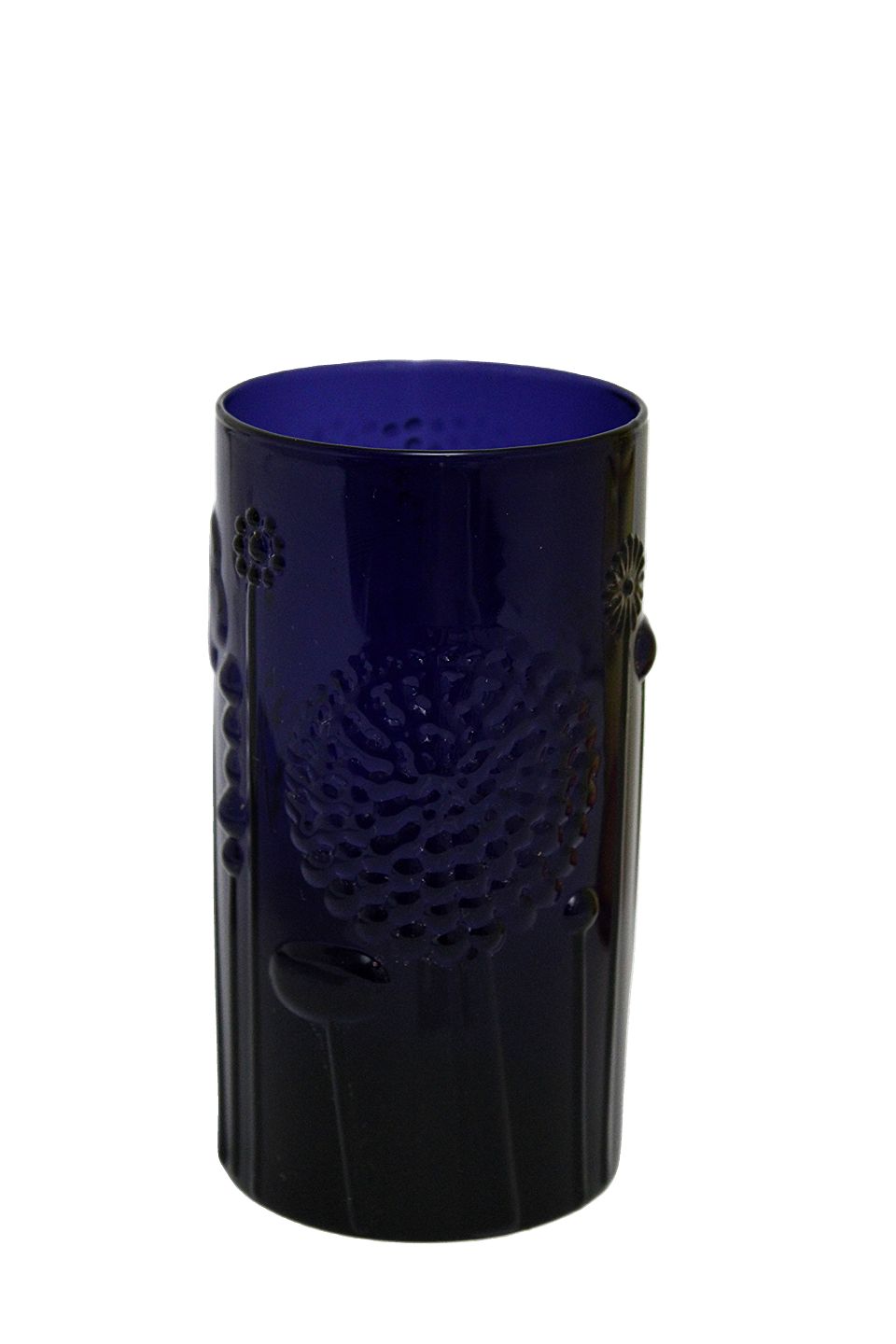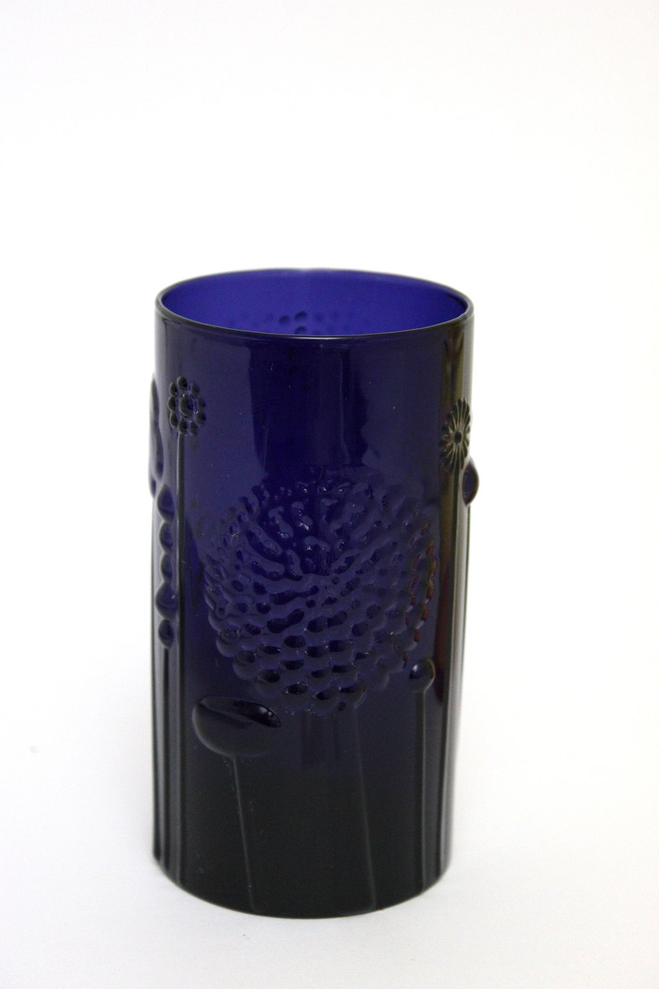 Iittala, Finland, Blå/violet cylinderformet Flora vase med blomster i relief. Designet af Oiva Toikka 1970'erne. Højde 12 cm. Diameter 6,5 cm. Flot stand. Pris: 450 kr. stk. Lager: 1