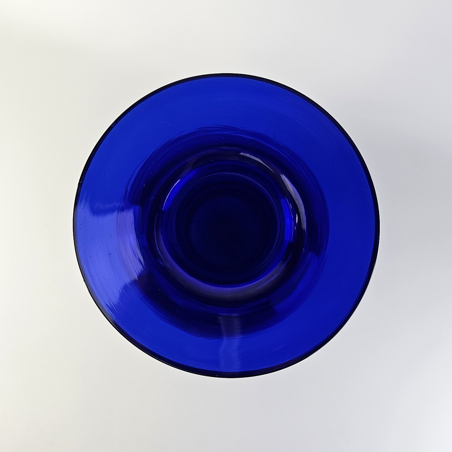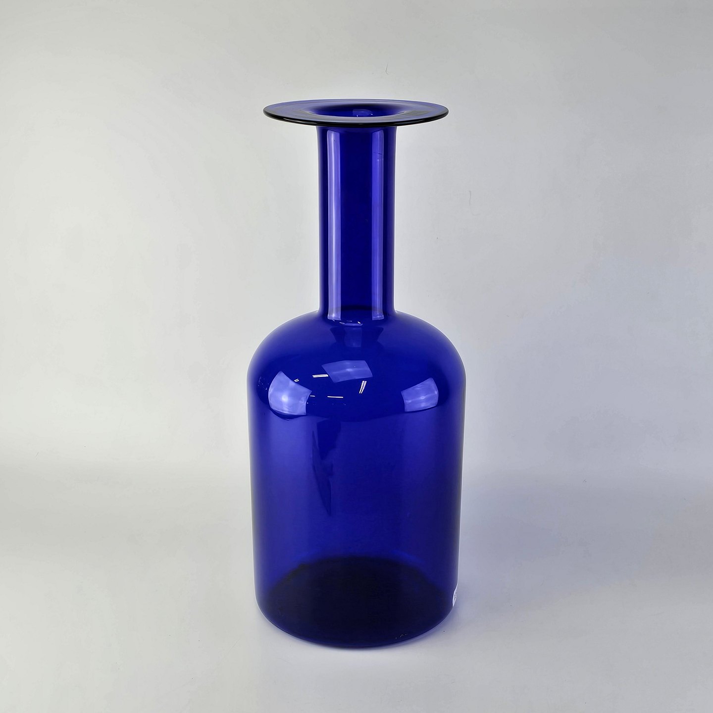 Koboltblå gulvvase af glas med lang hals og stor krop.