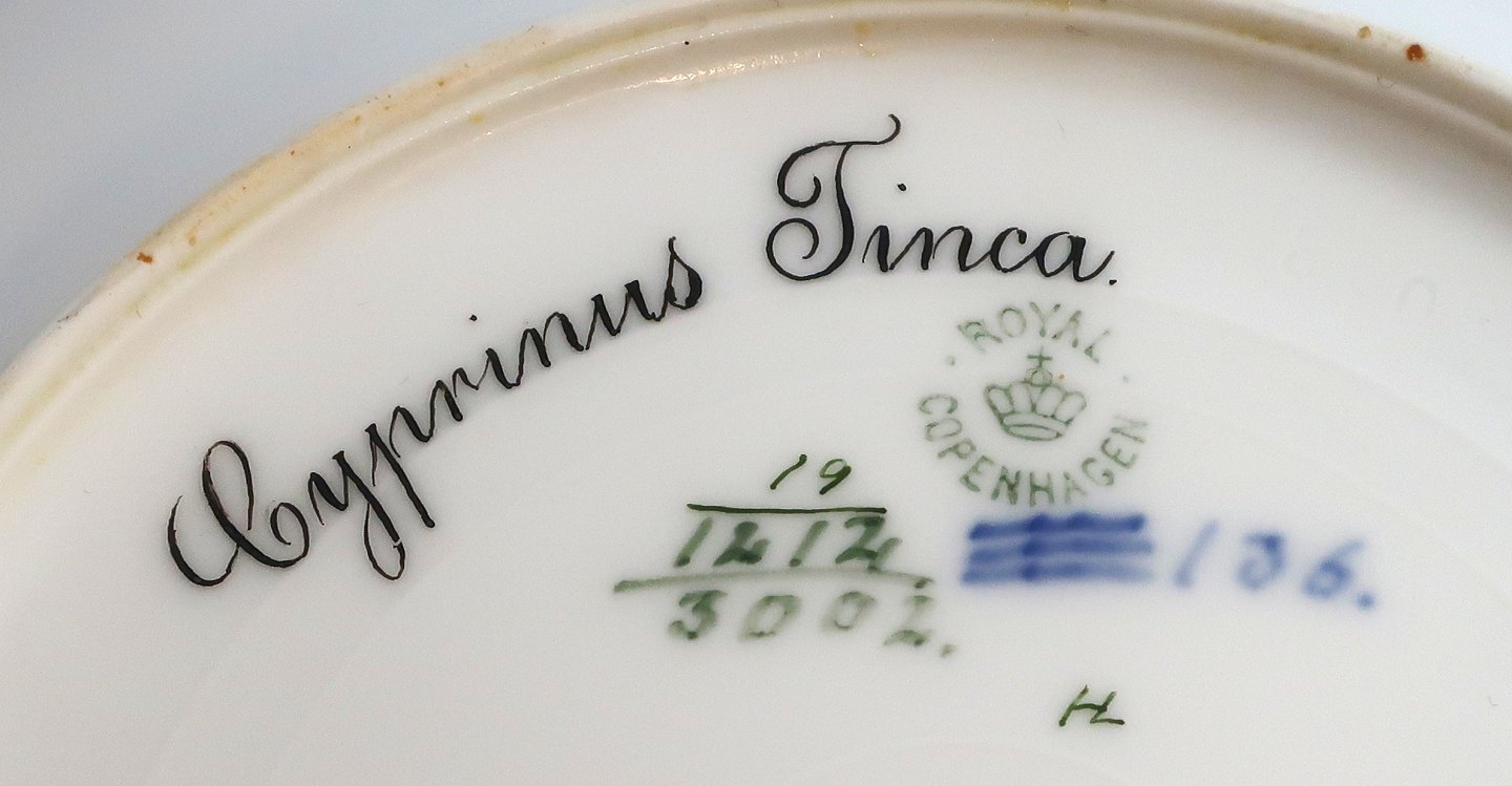 Royal Copenhagen. Angelgestell Nr. 19. Modell 3002. Durchmesser 22,5 cm. Cyprinus tinca. Hergestellt vor 1923. (1 Wahl)