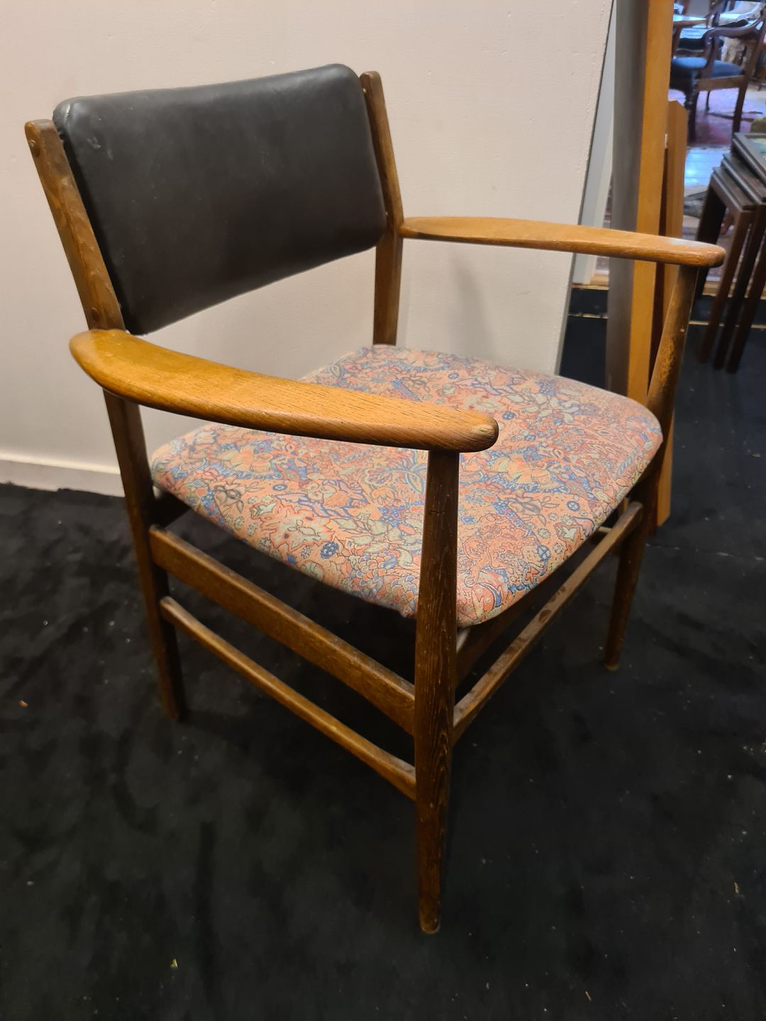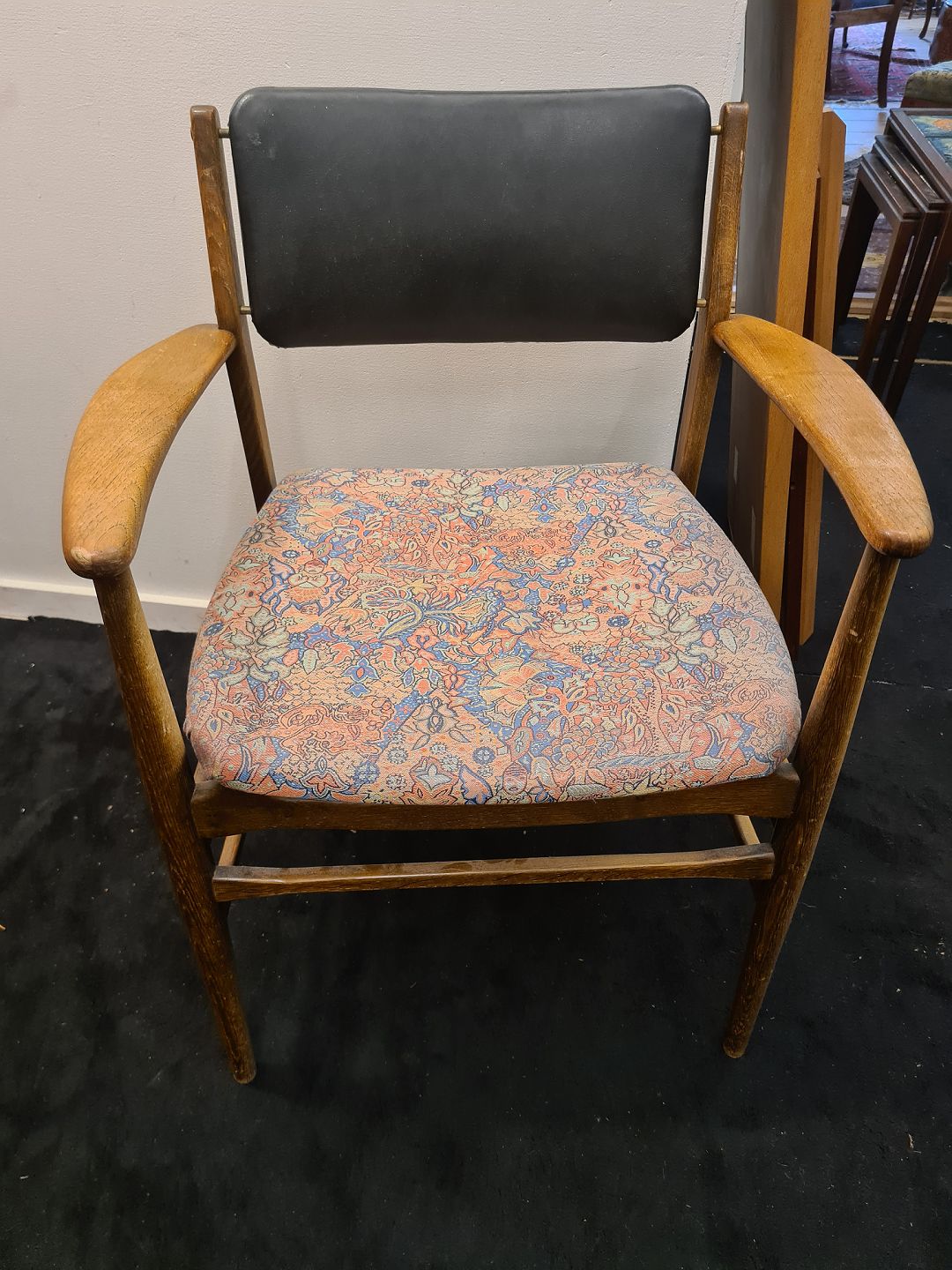 Text zugänglich auf Dänische: Dansk møbelproducent armstol udført i bejdset eg m. armlæn i massiv teak.