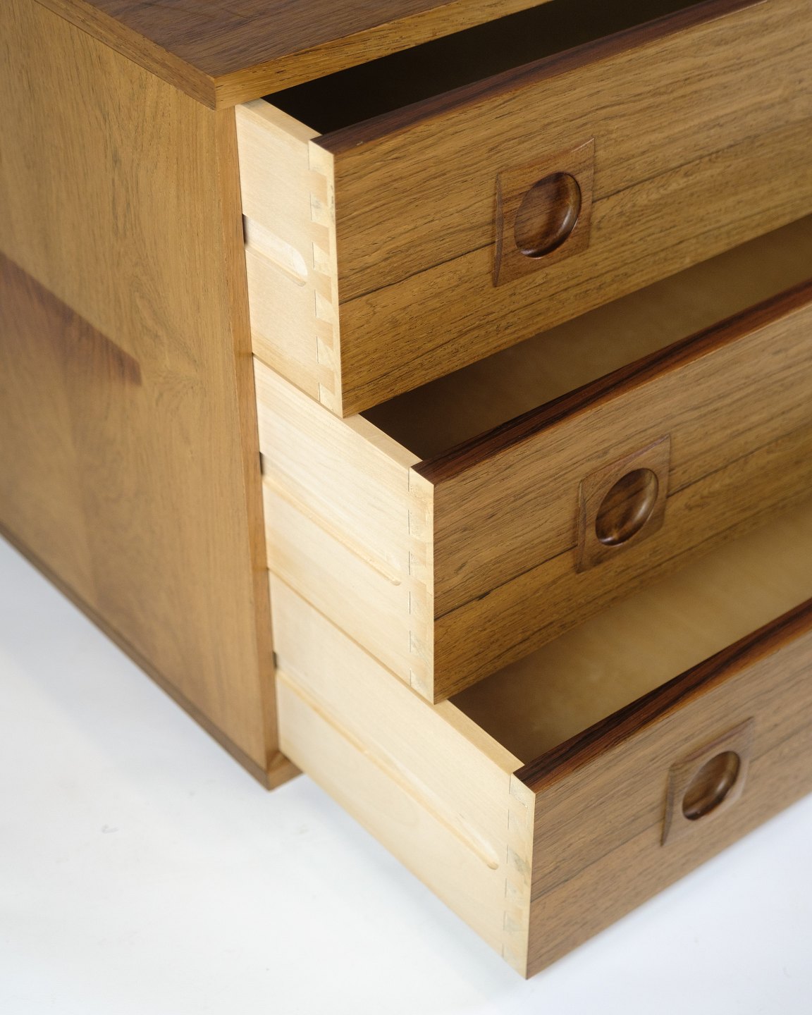 wall-mounted chest of drawers in rosewood, designed by Albert Hansen in the 1960s as part of the Model Excellent series. The three drawers have distinctive, milled handles and a rectangular shape. A fine example of Danish design, where function and aesthetics meet in a light and floating form.