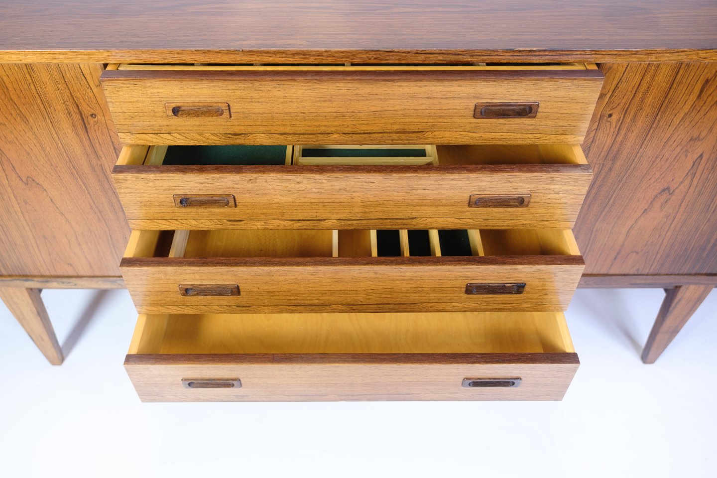 Large sideboard in rosewood with distinctive grain patterns, sliding doors and four centrally placed drawers with milled handles. The complete design and the slightly sloping legs give the furniture a floating lightness that characterizes Danish design from the 1960s.