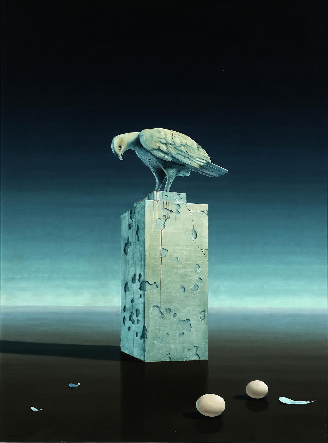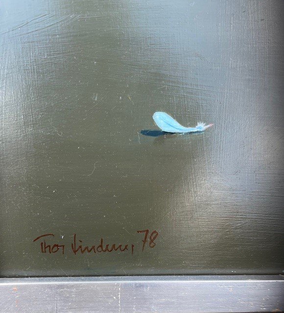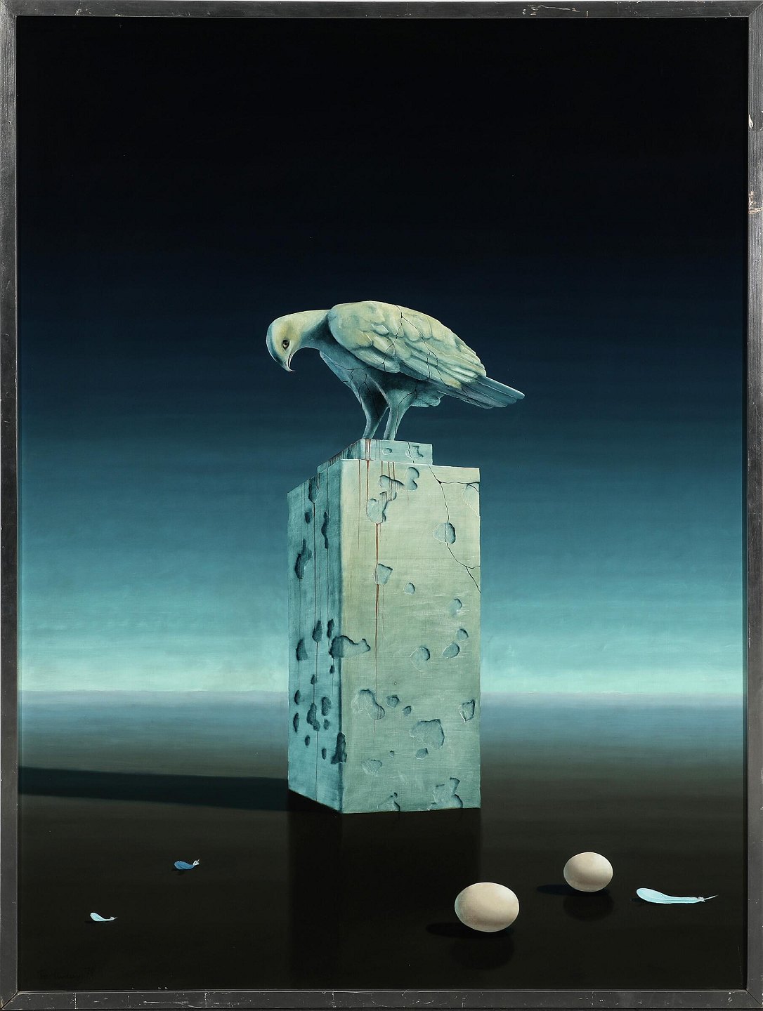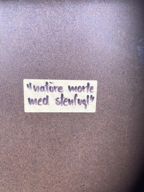 "Still life with stone bird" Oil painting on panel in silver frame.