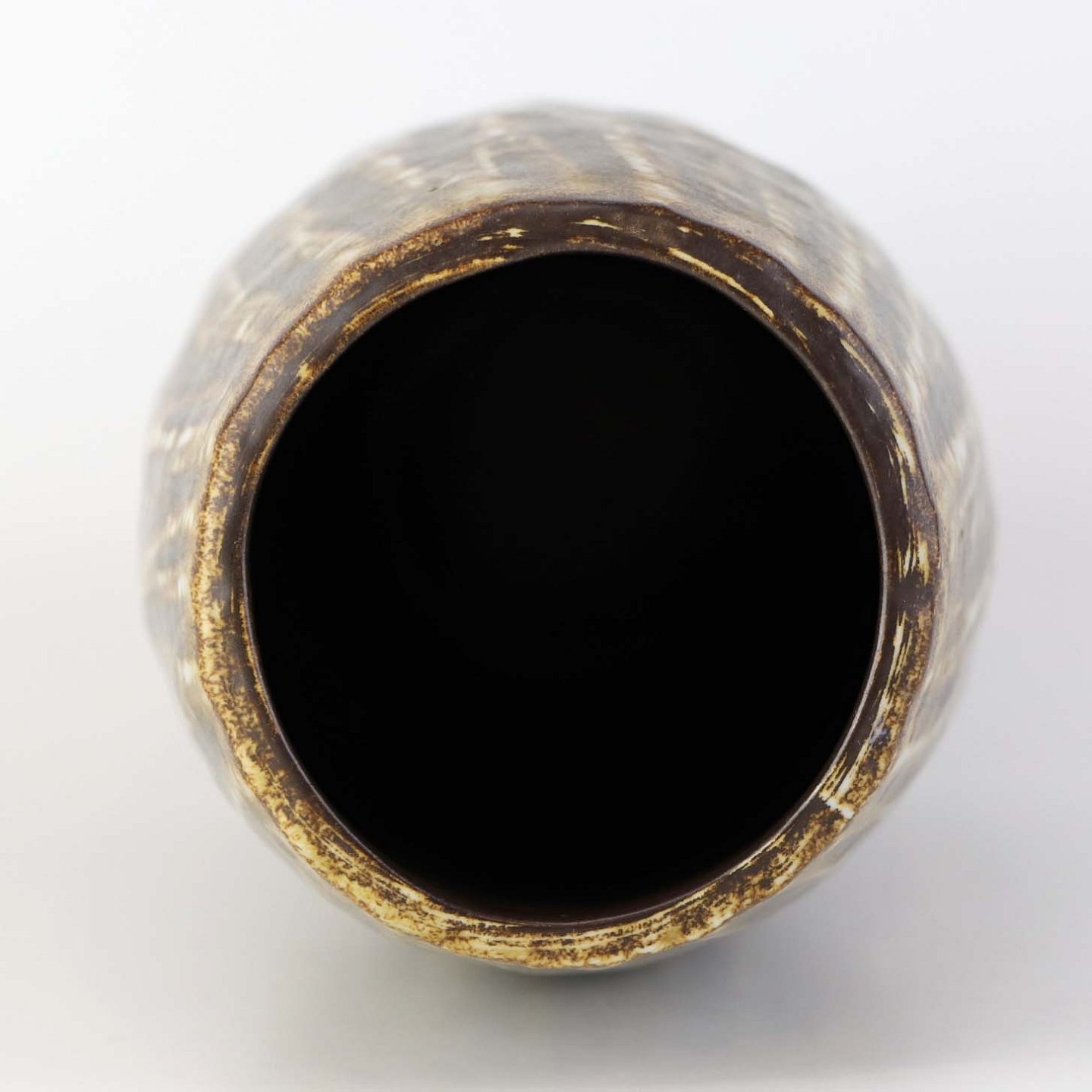 Cylinderformet vase i stentøj med glasur i hvide og gylden brune nuancer. Nr. 6
