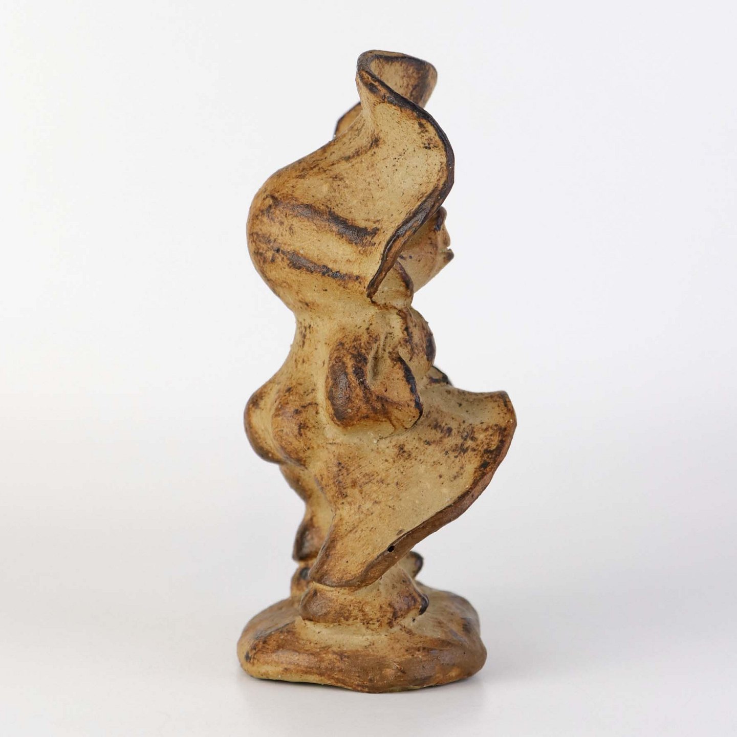 Fremstår med to brændingsrevner. En ved kysekanten og en ved brystet samt mindre ujævnhed i keramikken ved det ene ben.