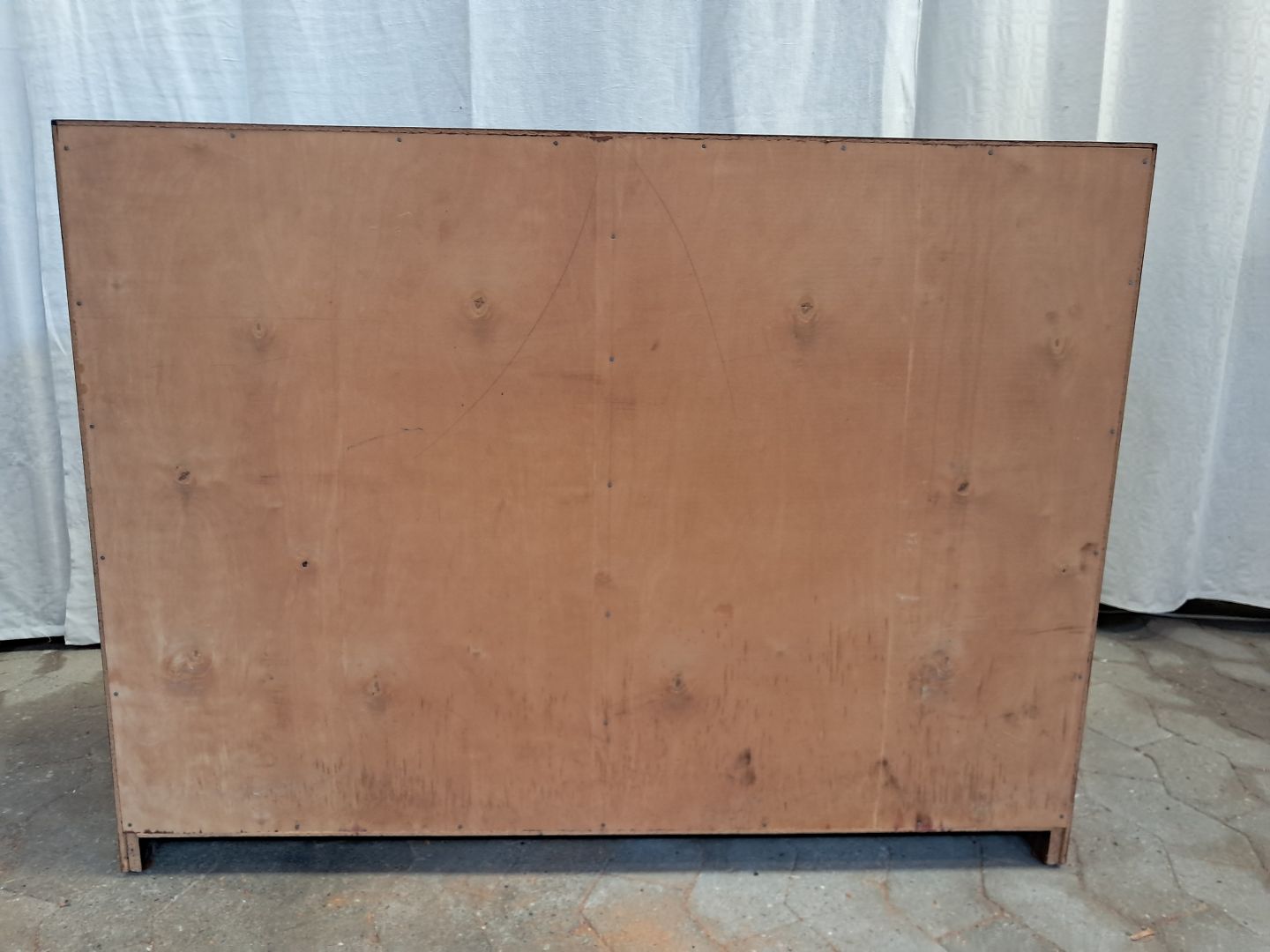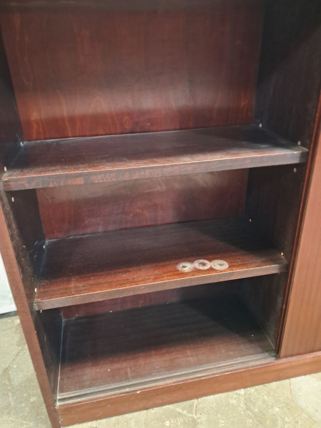 Reol i finert mahogni med skydelåger, fra 1980erne.