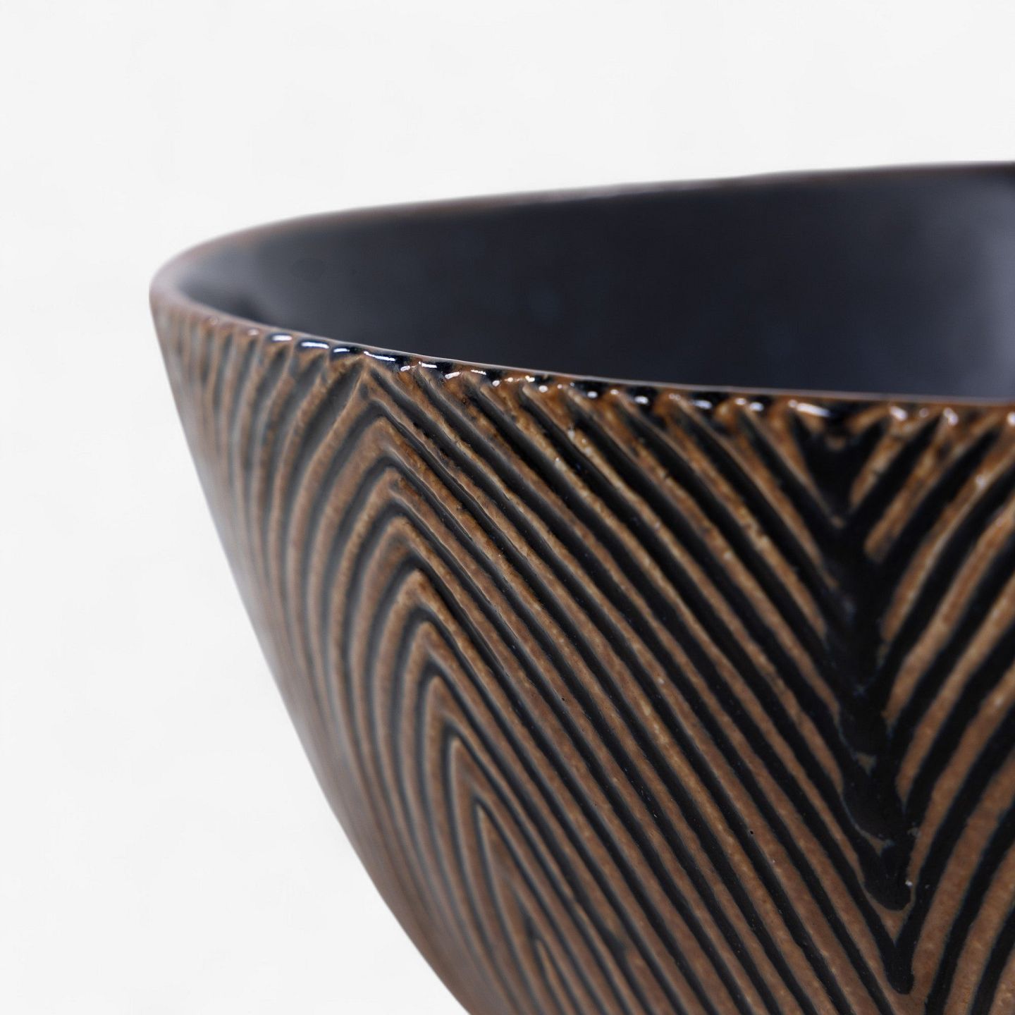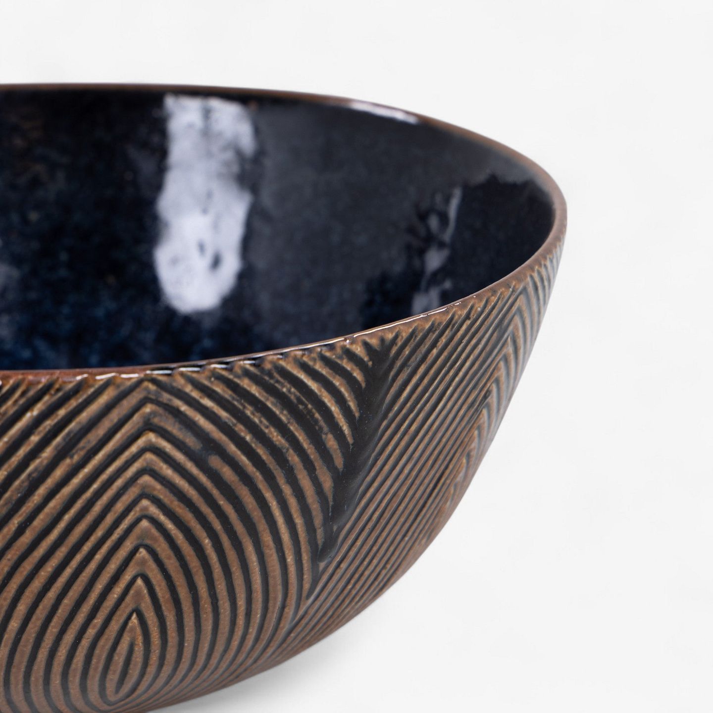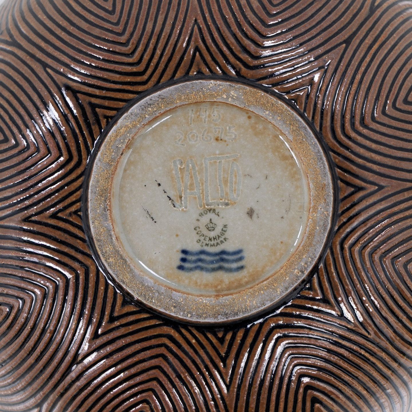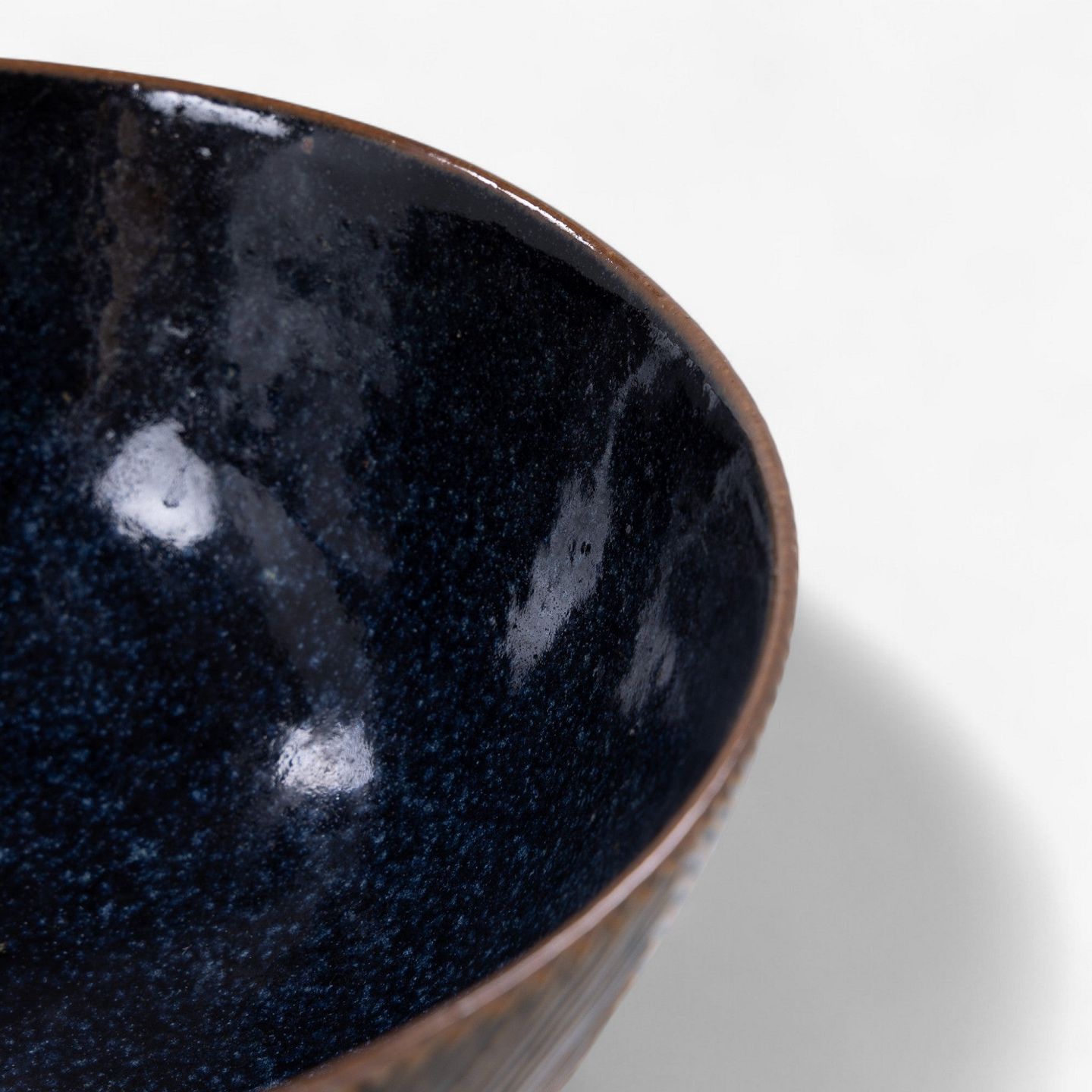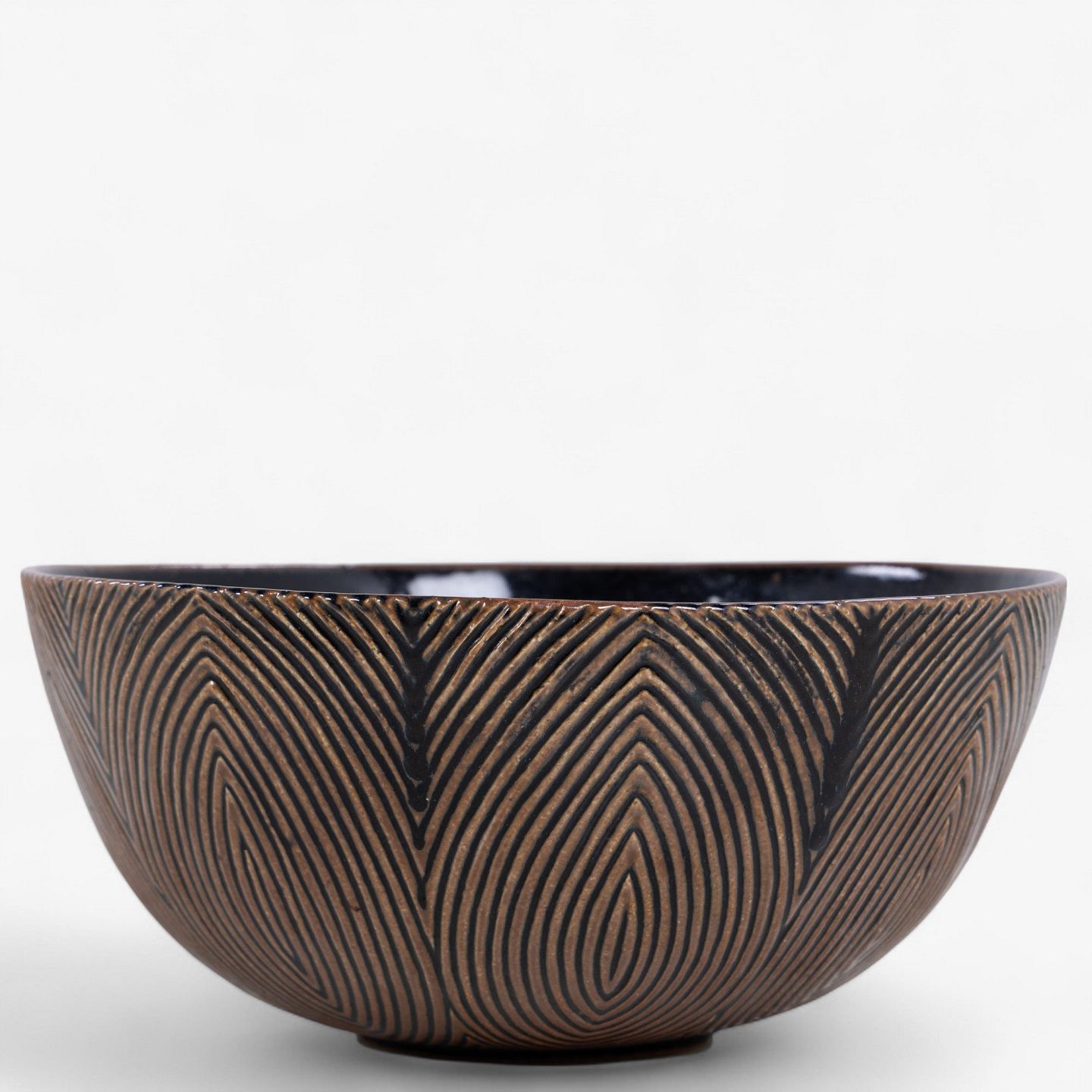 Stor og sjælden riflet skål, glaseret med hhv. Sung-glasur og indvendigt en blåmuslingeglasur. Model 20675. Signeret. Formgivet i 1944.