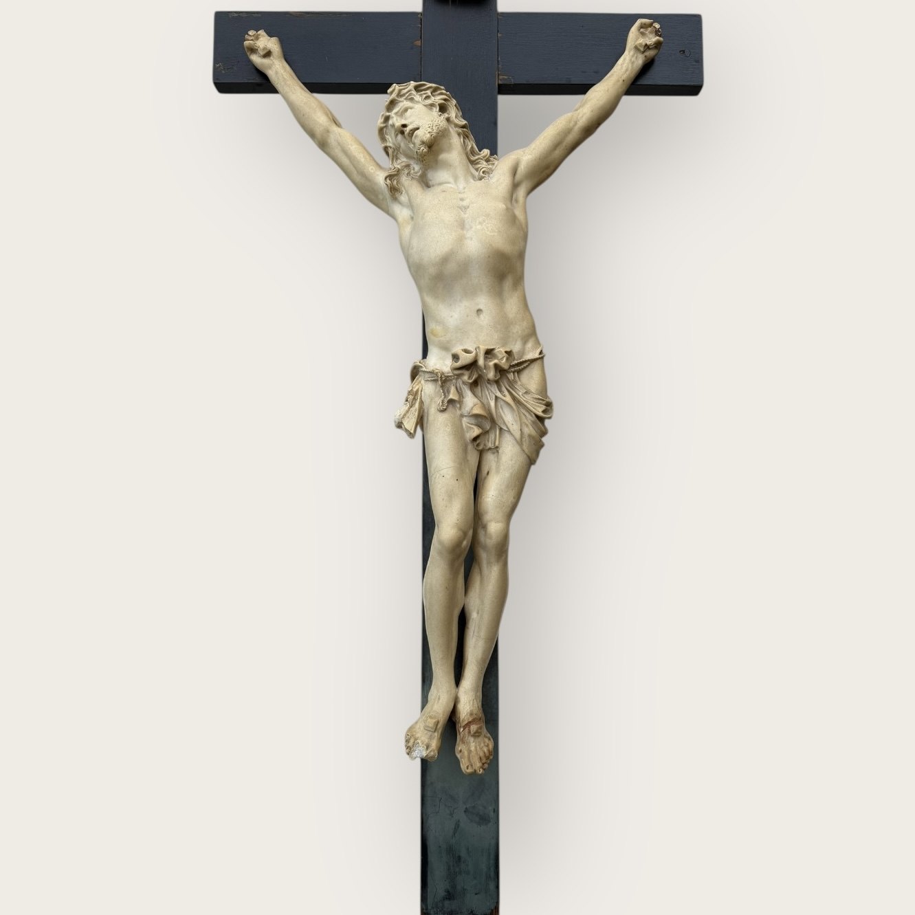 Stort ældre katolsk trækrucifiks / kors med støbt Jesus figur, en del småskader på især hænder og fødder (se foto) Mål 85x40cm
