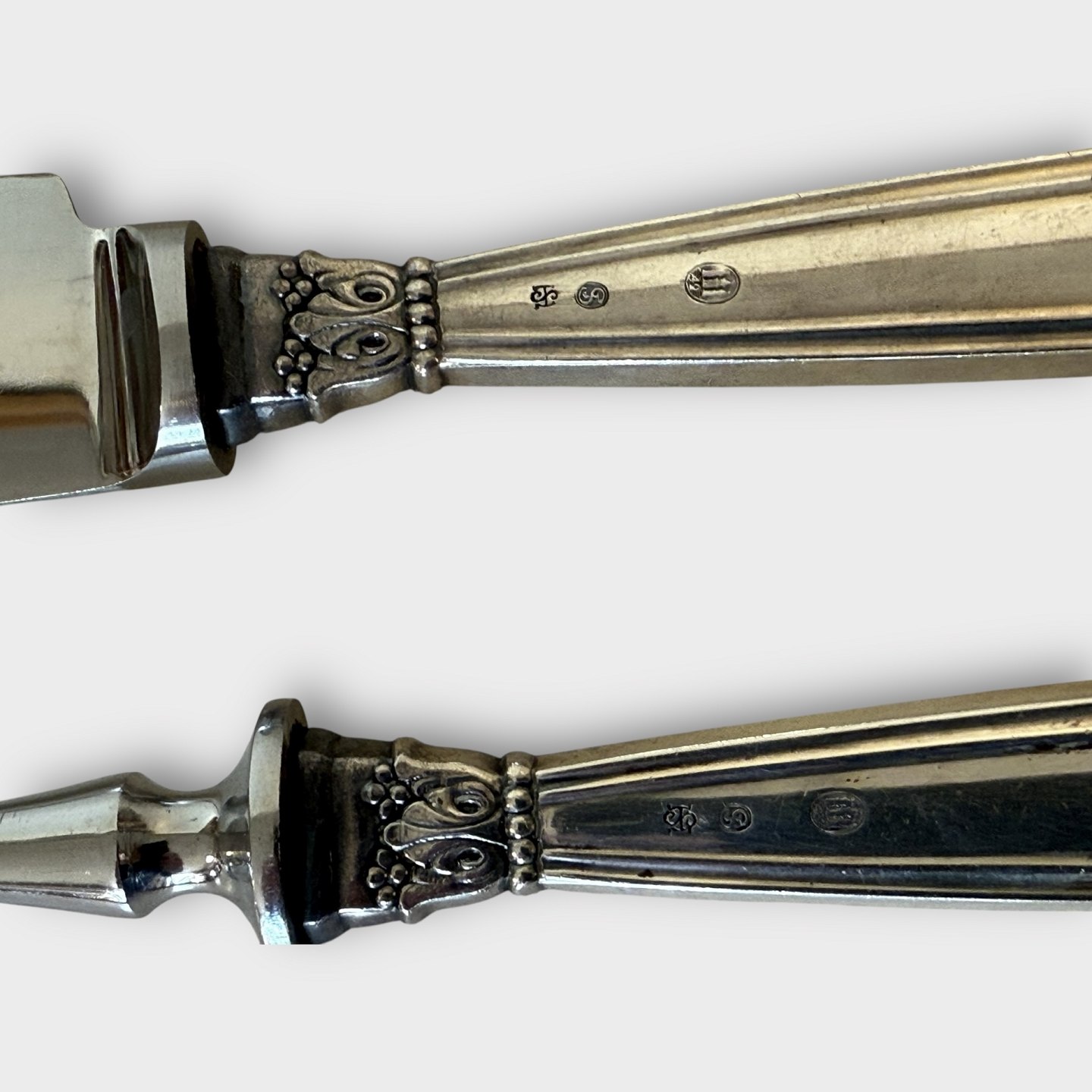 Slicer set, Karina, cutting set in three-tower silver, handles with engraving from 1944 (From Nordland), stainless steel blades from Raadvad knife factory, Length 30.5 and 26cm, fine condition.