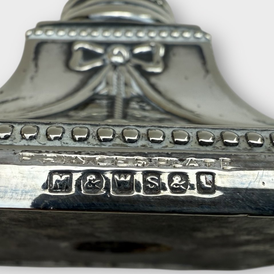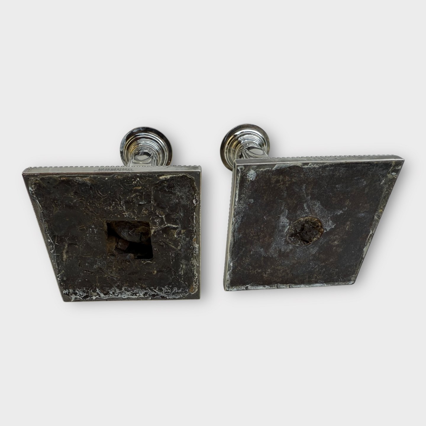 A set of English silver plated candlesticks, filled in bases and with loose candle cuffs, base 8x8 cm, Height 14 cm