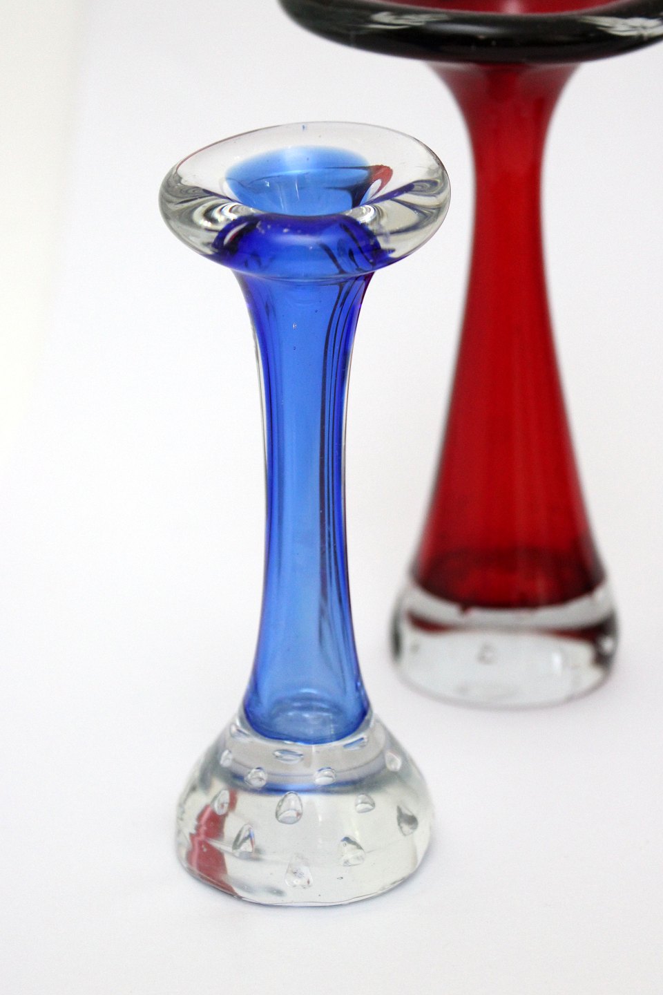 Lille blå med bobler i bund. Højde 12,5 cm. Pris: 150 kr.