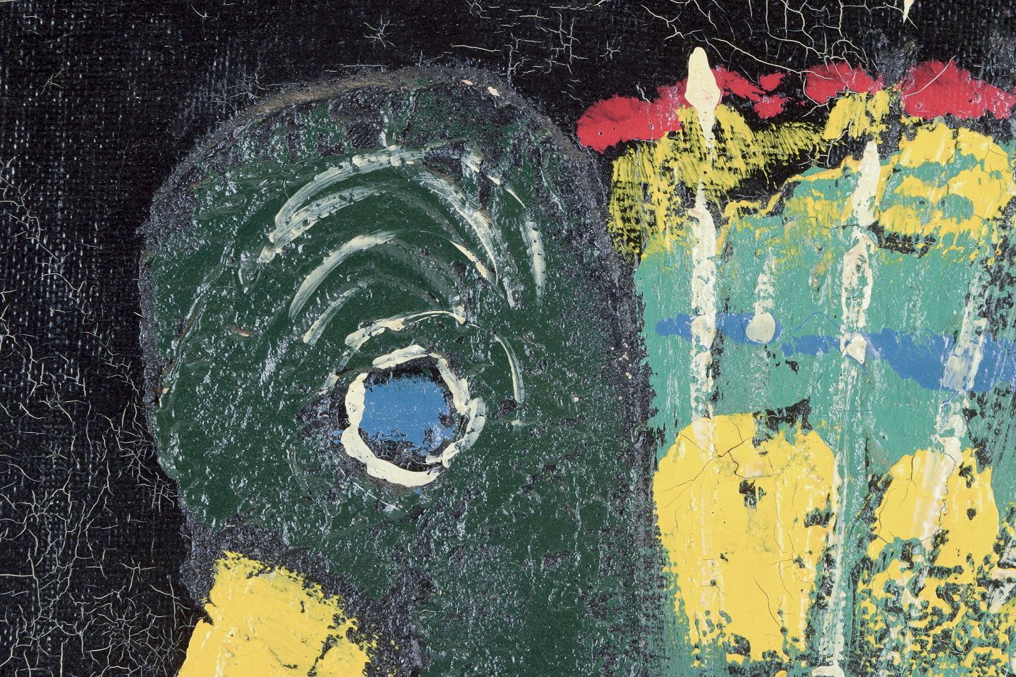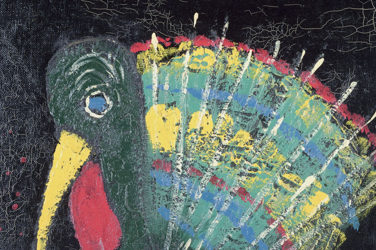 I flot stand med krakeleringer i lærredet.