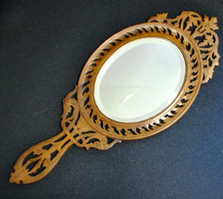 Sorrento hand mirror, 19th century. Italy. Polished olive wood with inlays in the shape of flying swallows and text: Ricordo. Faceted mirror. L.: 40.5 cm. W.: 17 cm.
