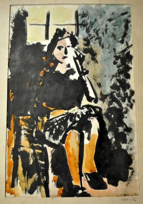 Kaare, Hans (1950 - ): Siddende kvinde i en stol. Tusch, akvarel. Signeret: Hans Kaare 1976. 40 x 26 cm.