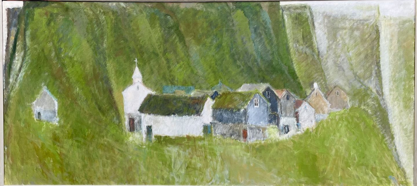"Bygd på grønt fjeld" Færøerne, oliemaleri med sølvramme i original stand.