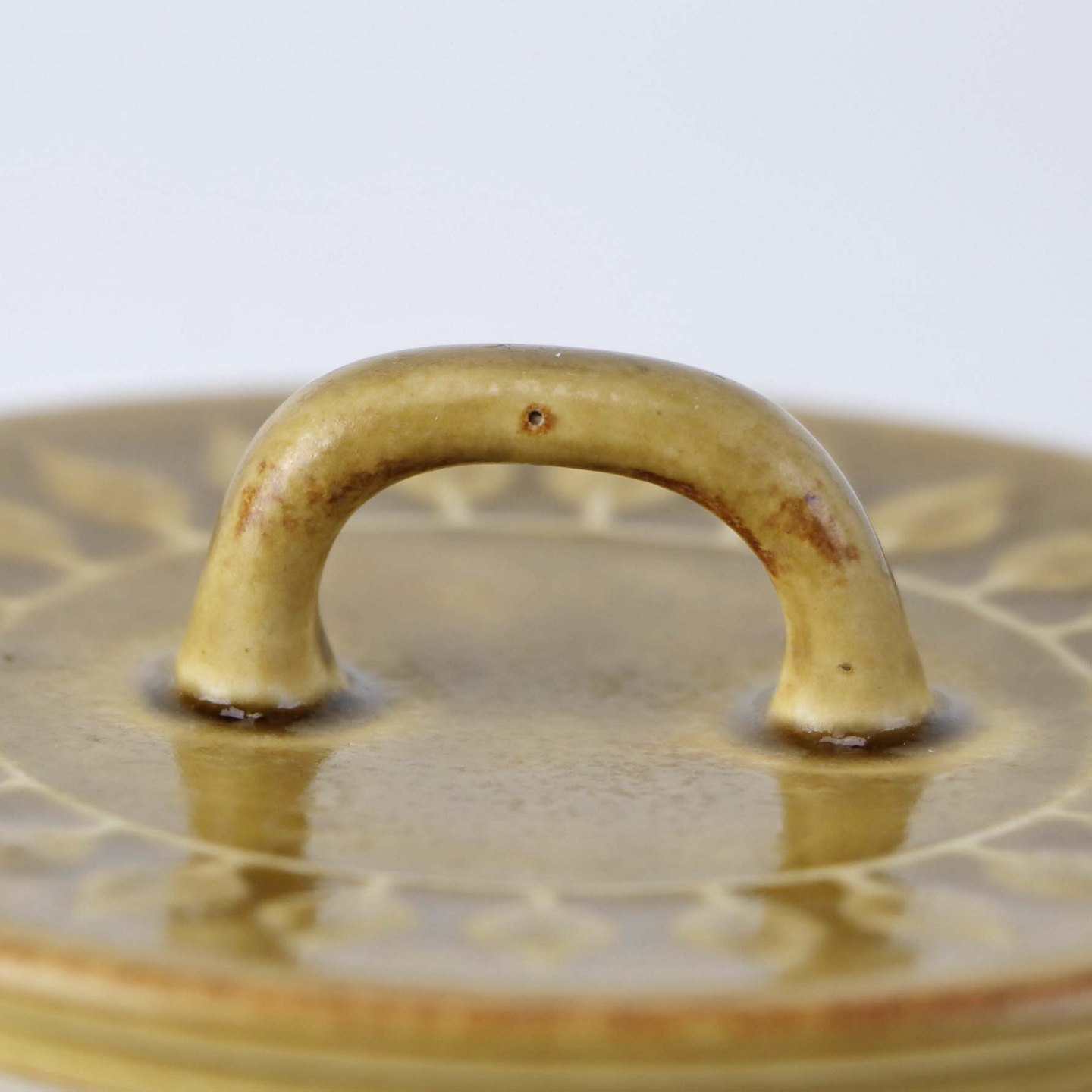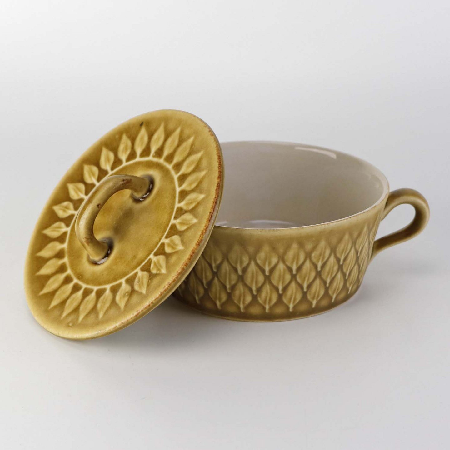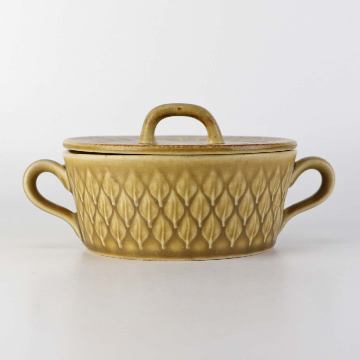 Suppekop i stentøj med hanke og låg fra stellet Relief