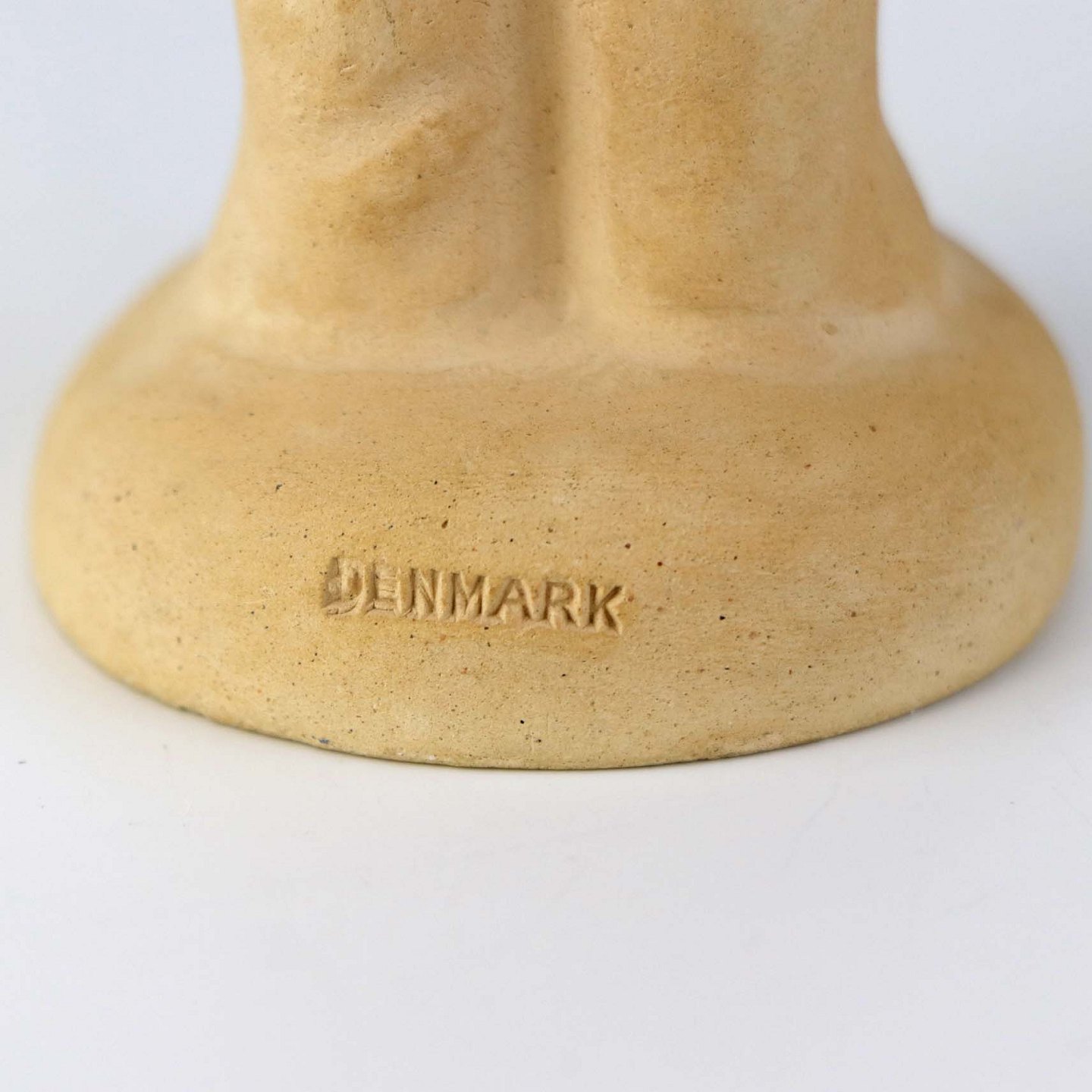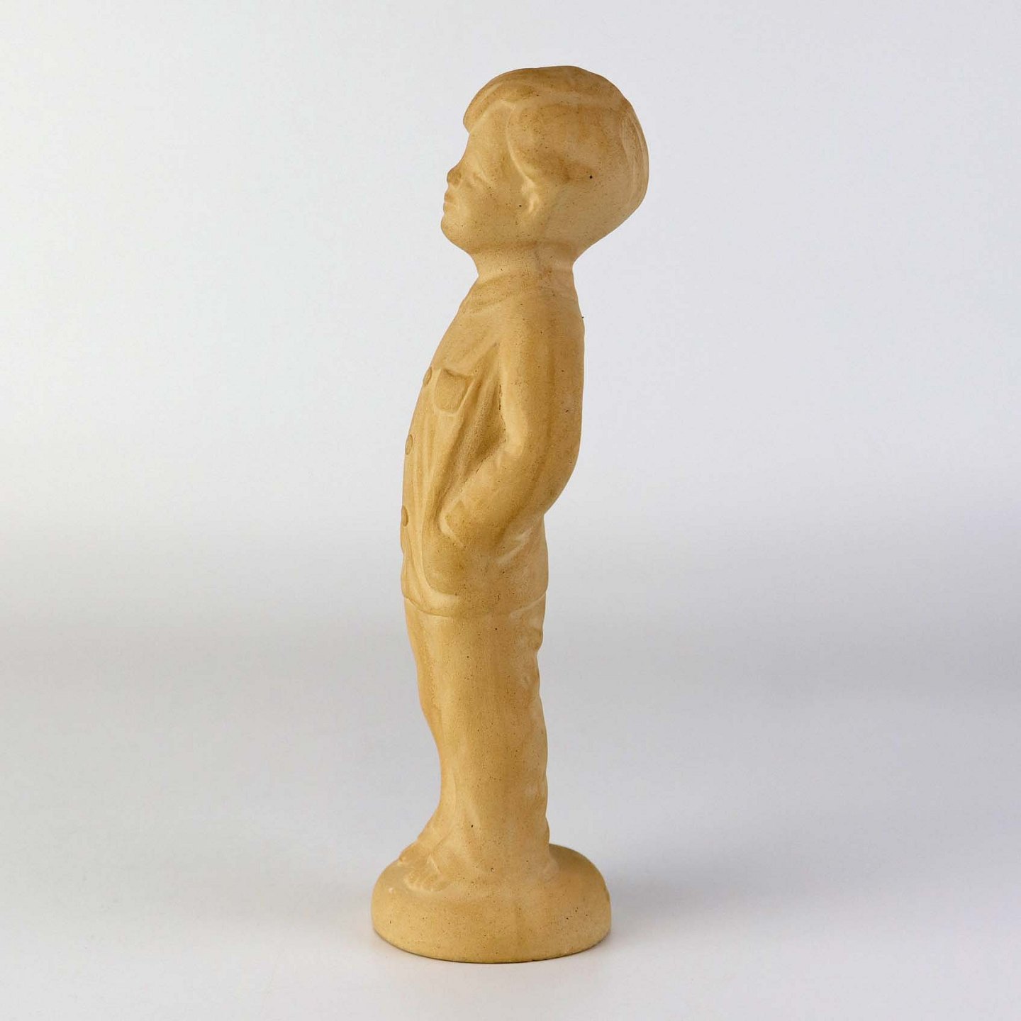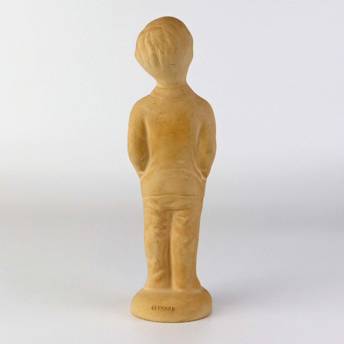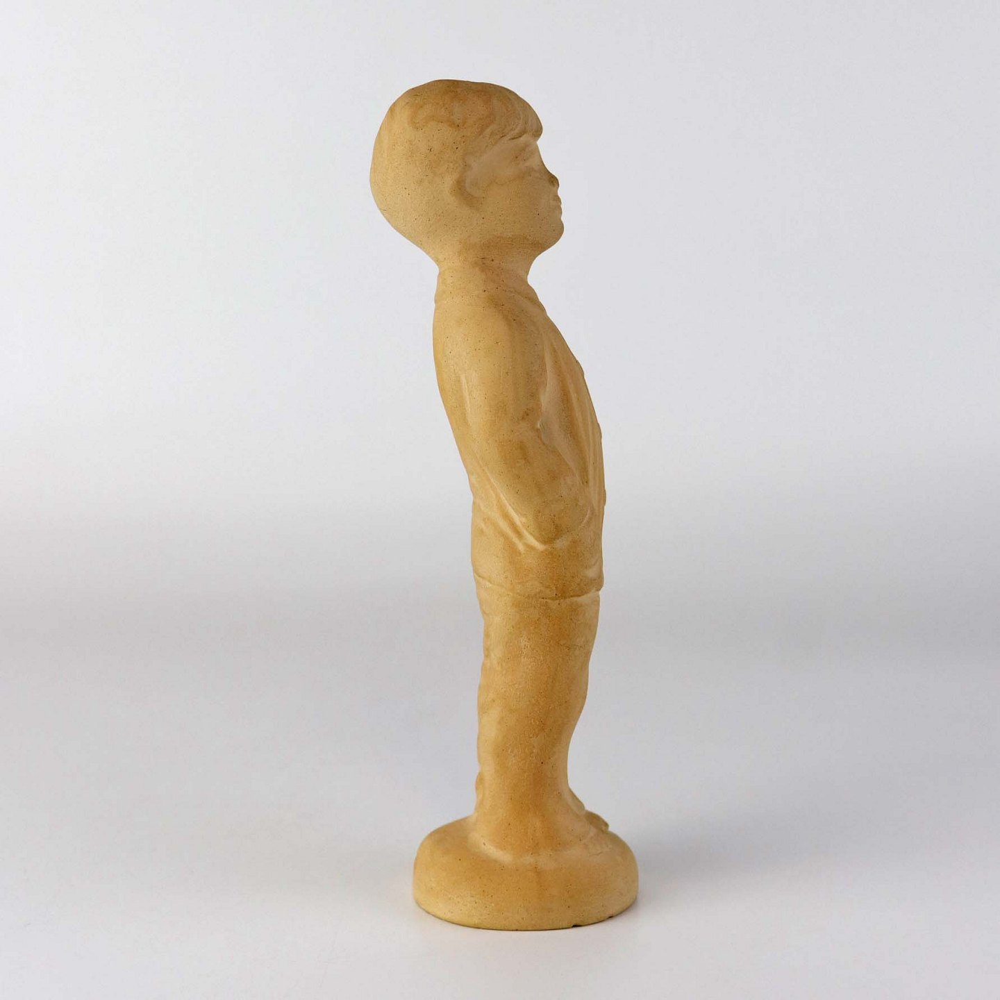 Figur i terracotta med motiv af stående dreng i pyjamas.