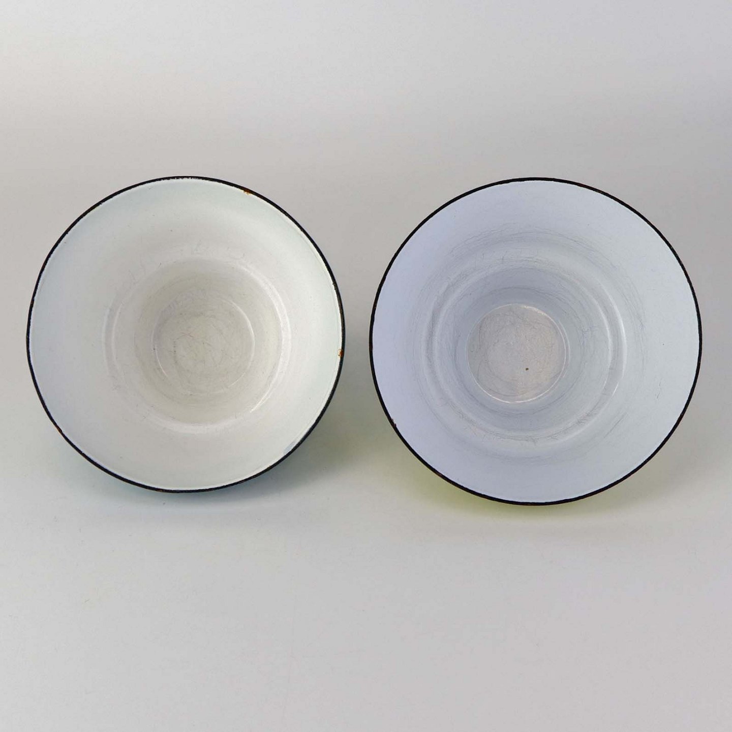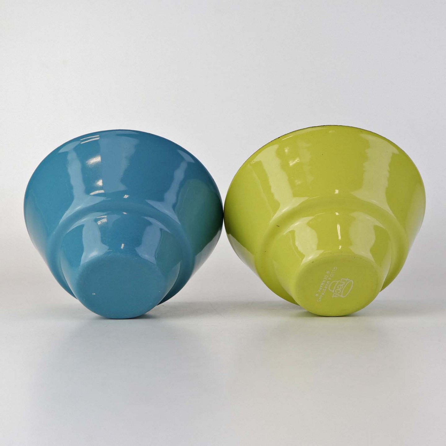 Text available in Danish: Et sæt med to mindre skåle i blå og limegrøn emalje med hvid emalje på indersiden. Model Treca