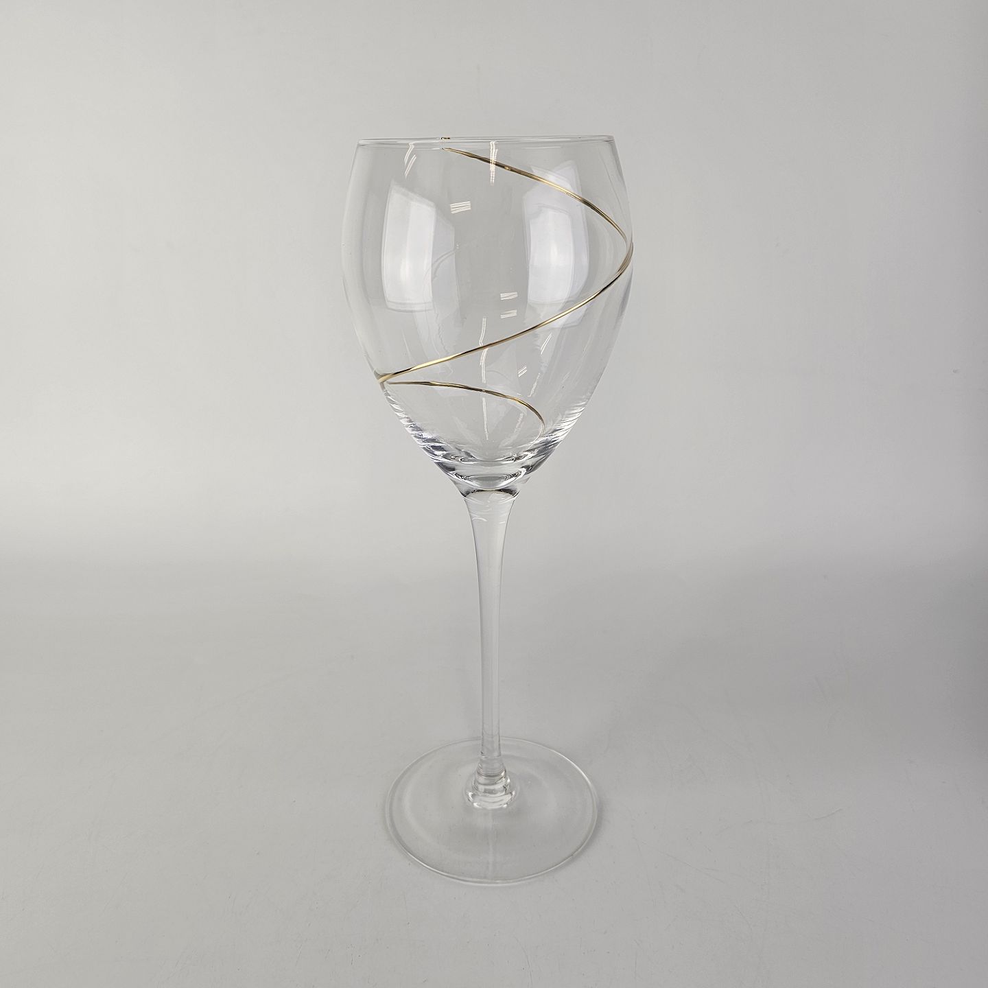 Rødvinsglas i klart glas dekoreret med guld snoninger fra serien Line Gold
