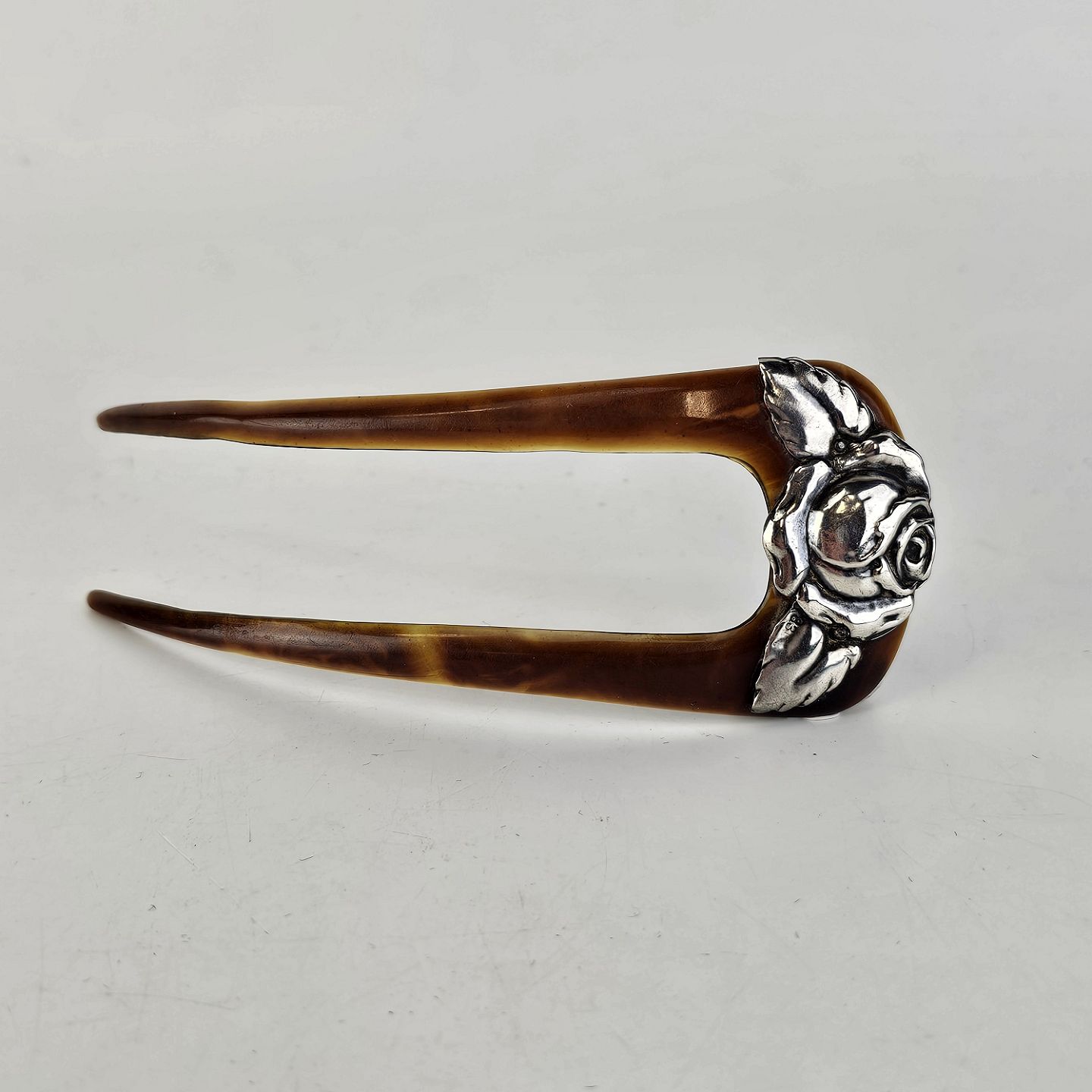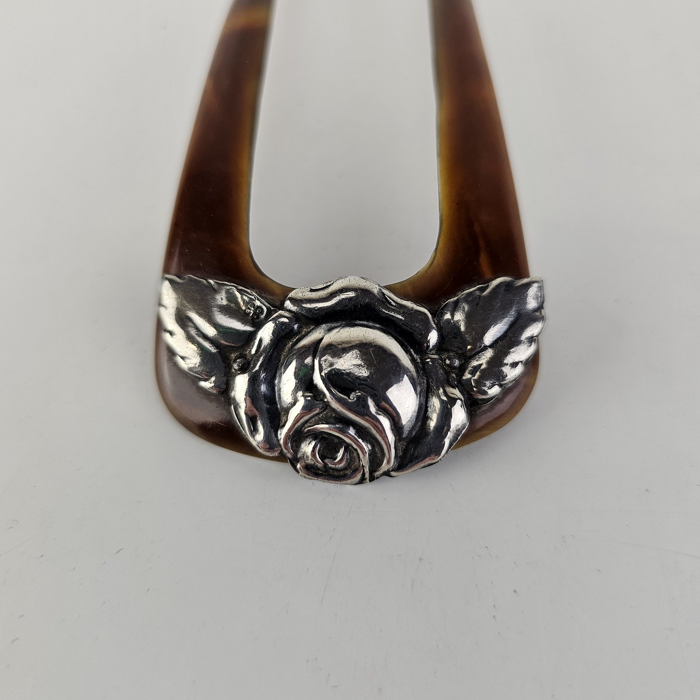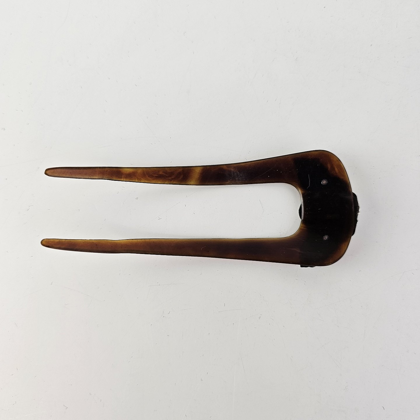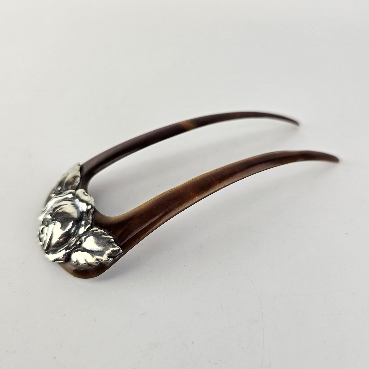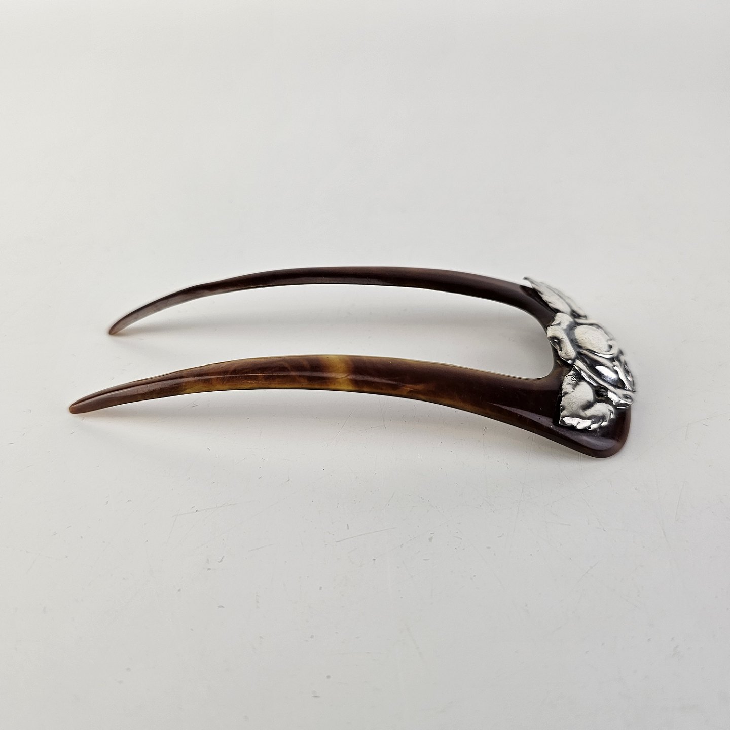 En hårnål fremstillet af skildpaddeskjold med ornament i sølv