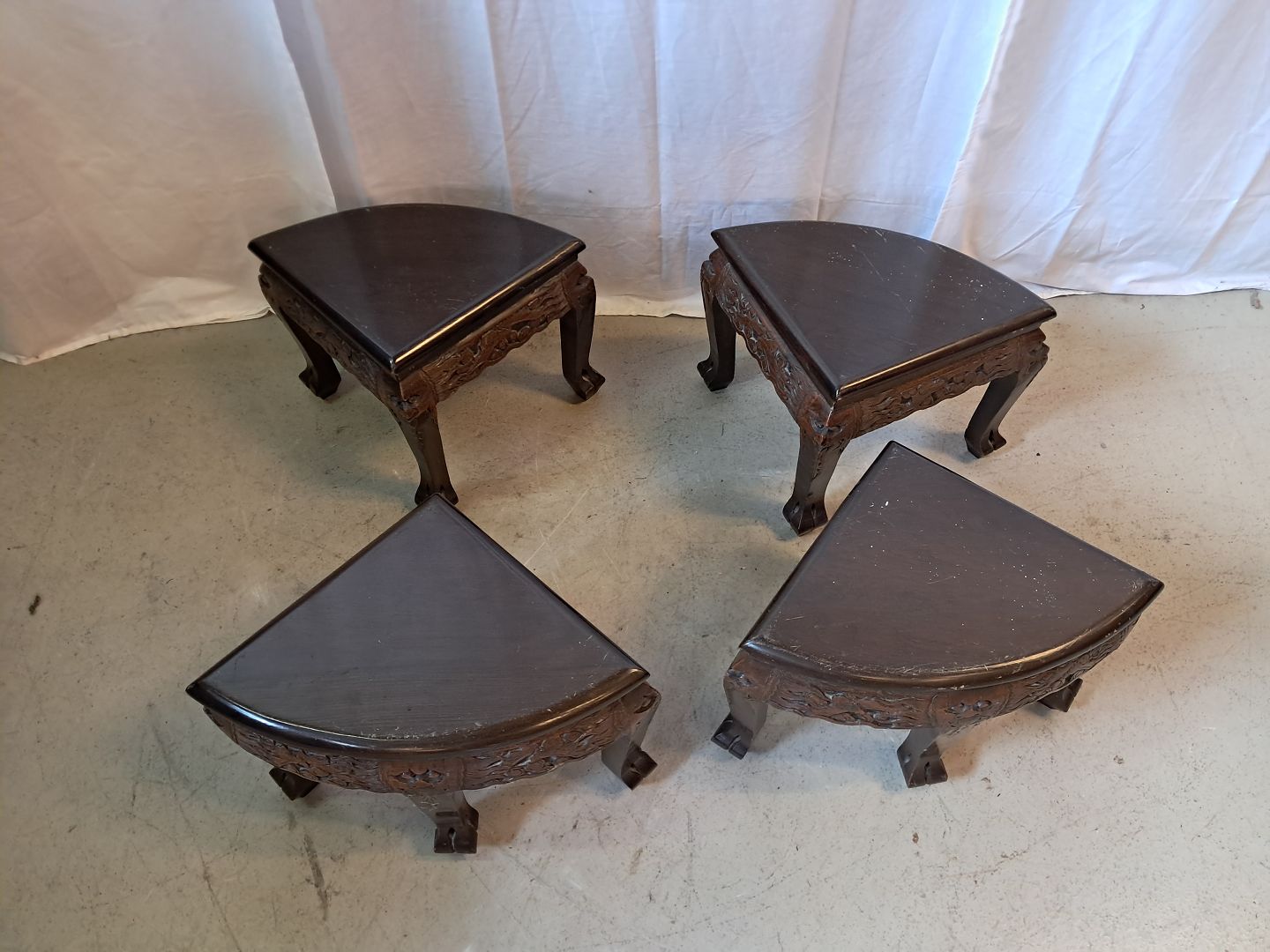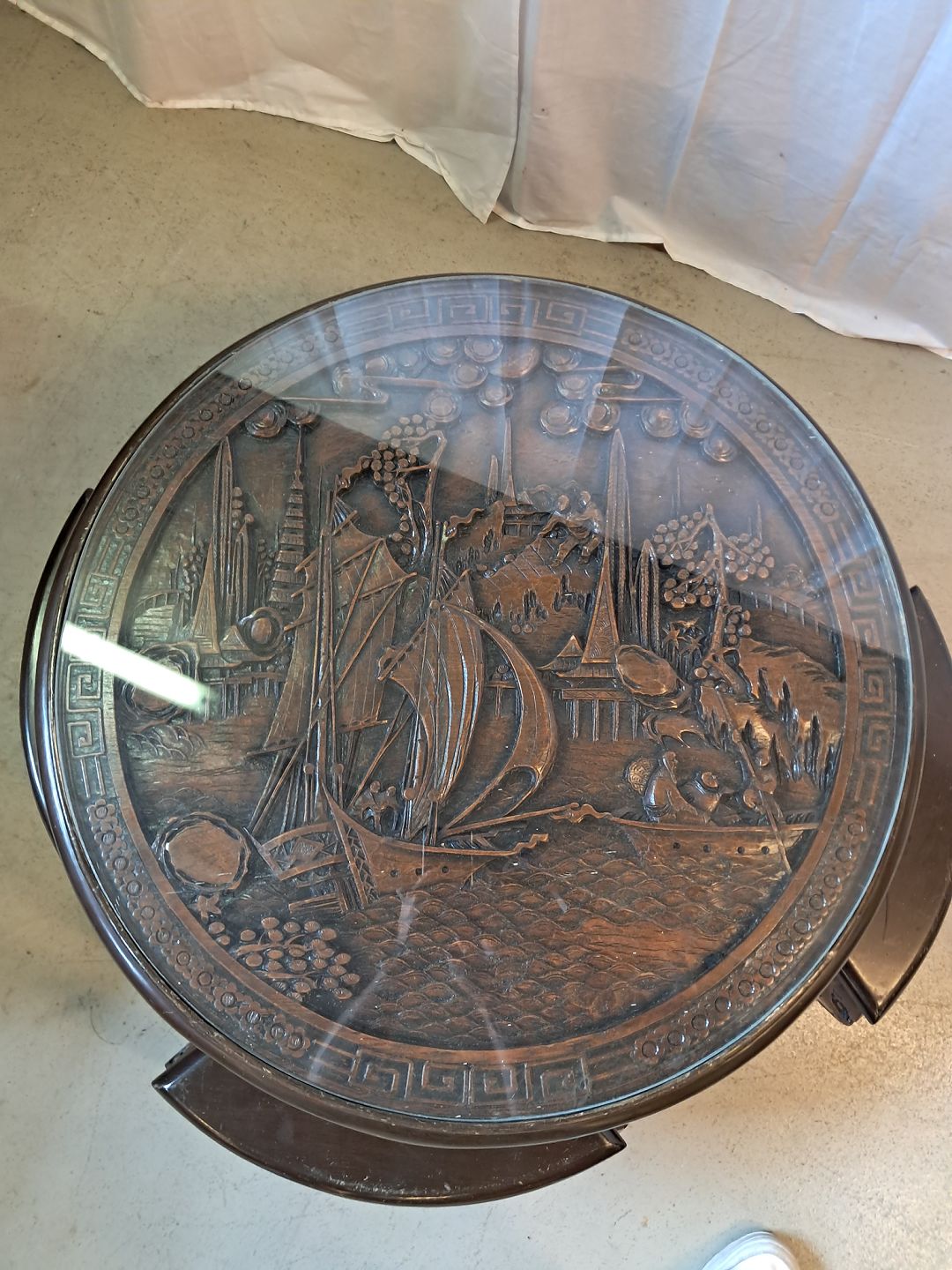 Kinesisk bord i massivt træ med glasplade og 4 taburetter, fra 1990erne.