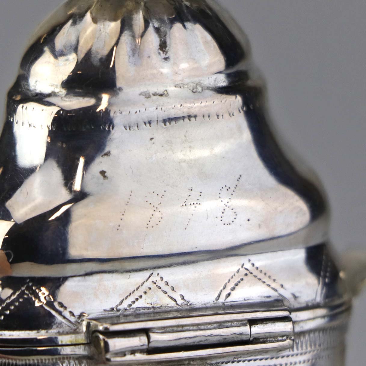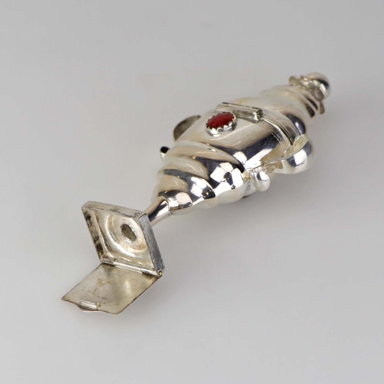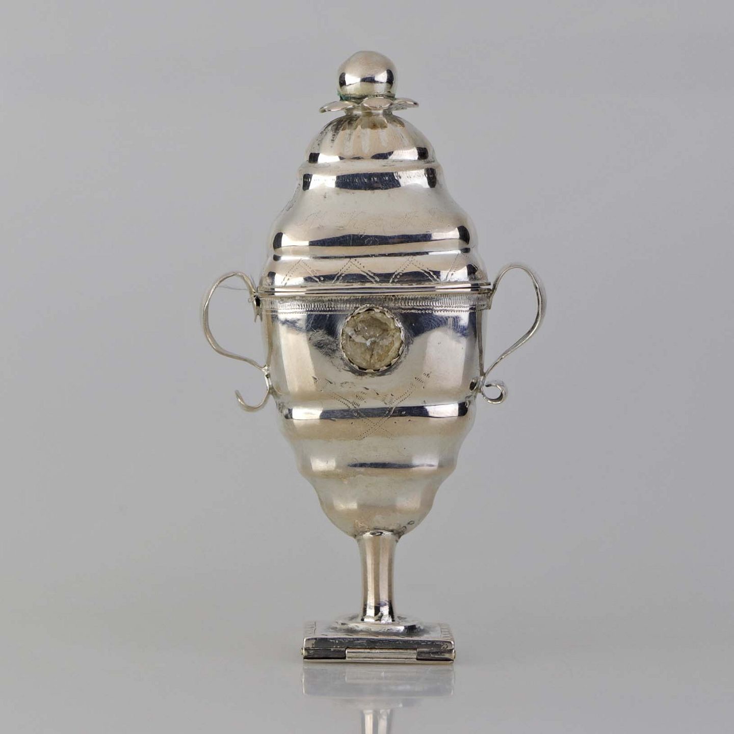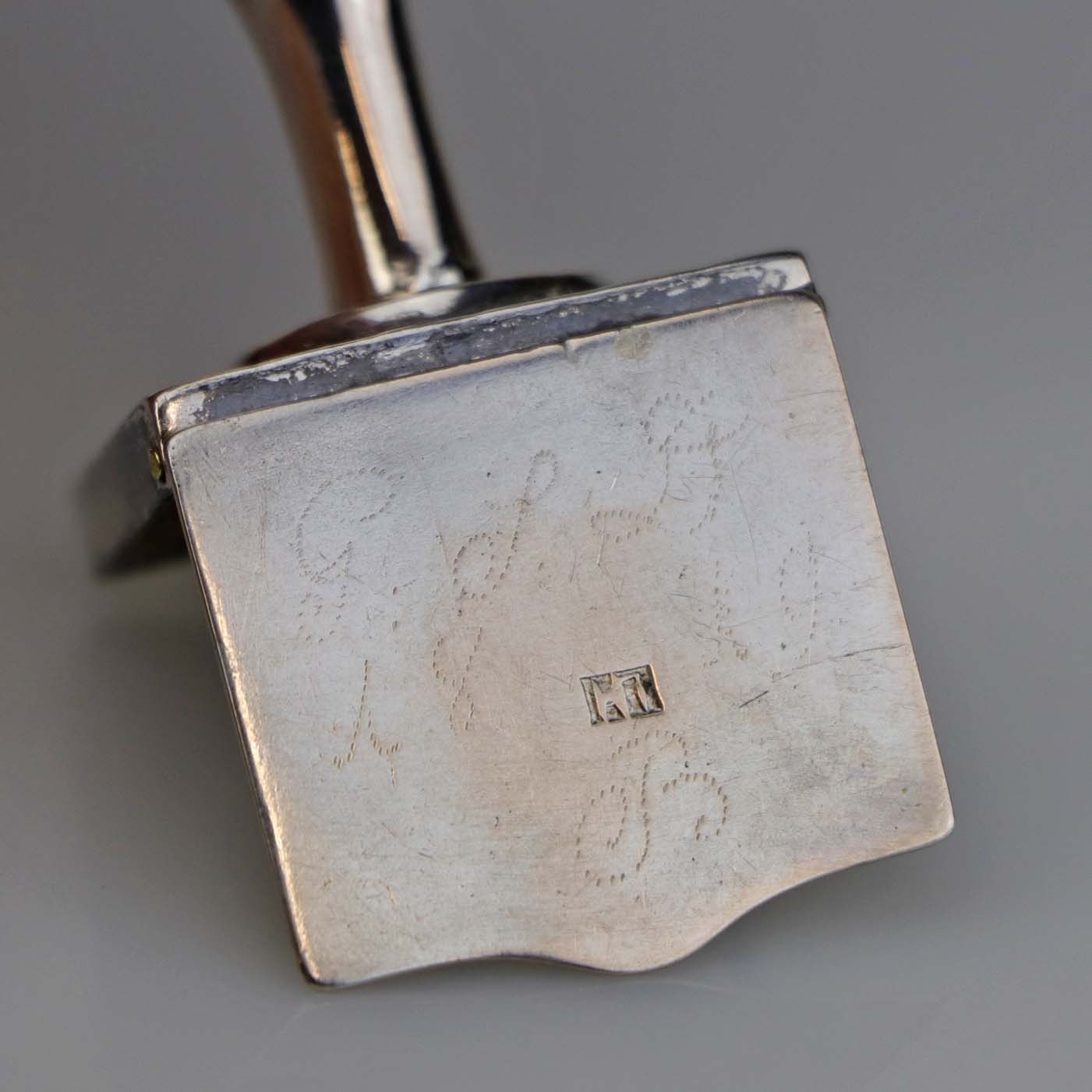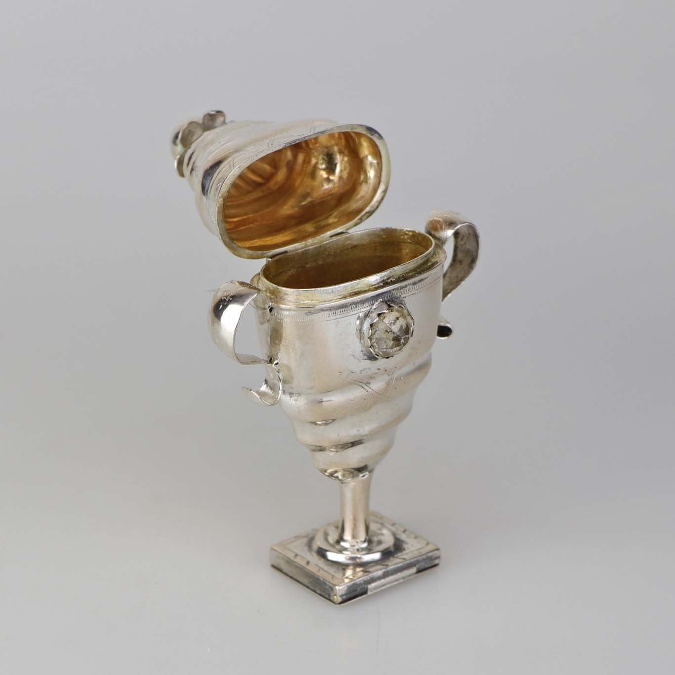 Hovedvandsæg i sølv med pynt af en hvid og en rød sten samt ekstra rum under foden. Fremstår med monogrammer og årstal 1819 samt år 1848