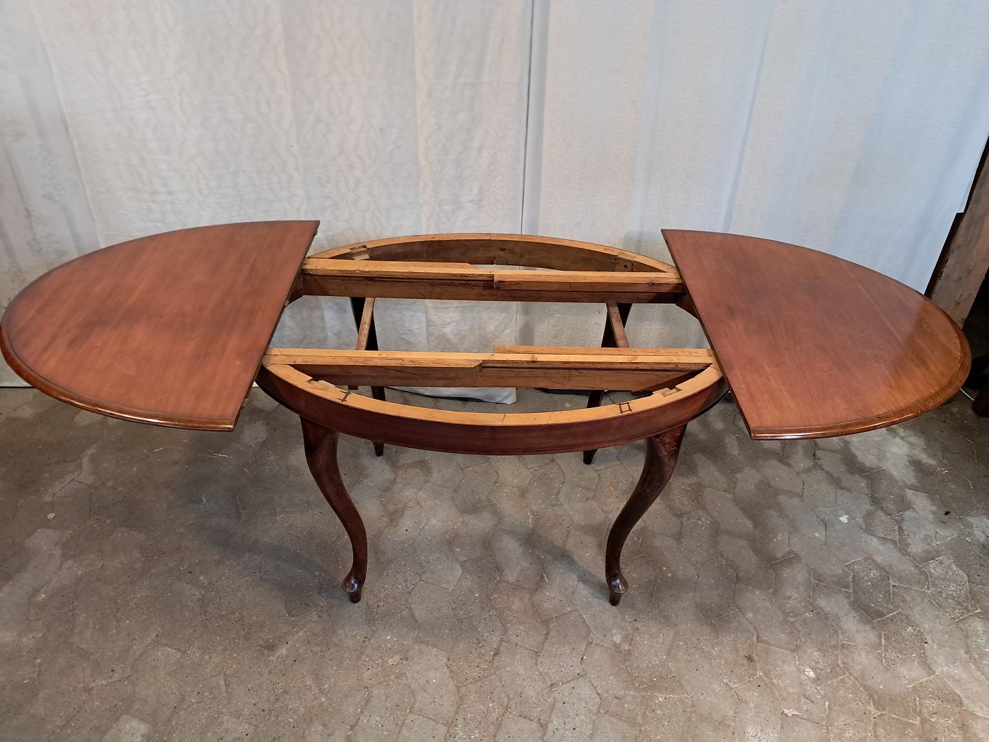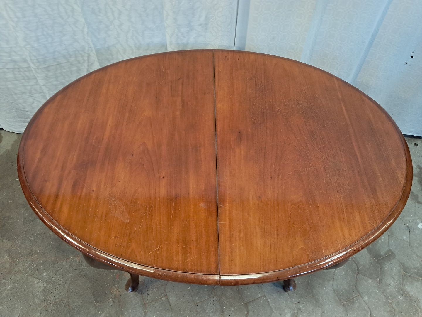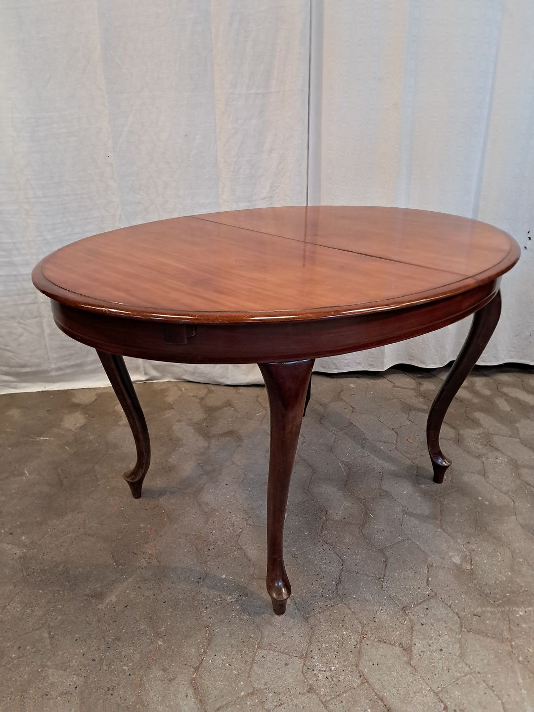 Text available in Danish: Ovalt salonbord i massivt mahogni med 2 tillægsplader, fra 1920erne.
