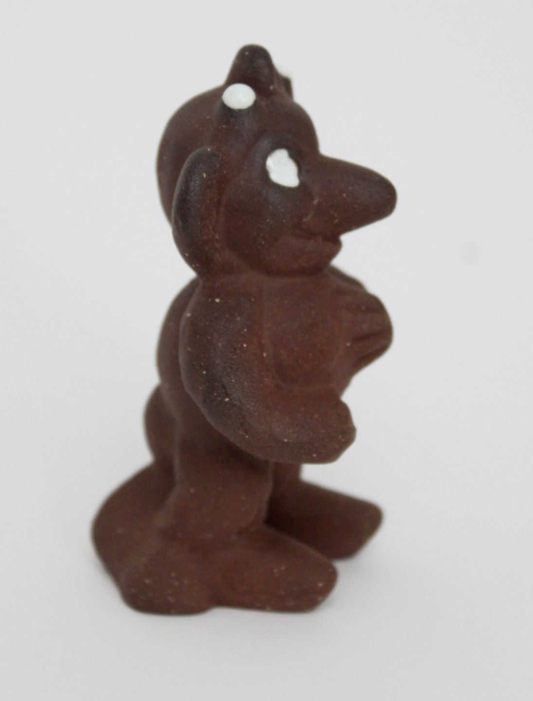 Text available in Danish: Michael Andersen, Bornholm. KrølleBølle uglaseret keramik med hvid glasur på horn og øjne. Antagelig Michael Andersen, men der er ingen stempel. Højde 8,5 cm. Sjælden udgave. Pris: 200 kr. stk. Lager: 1