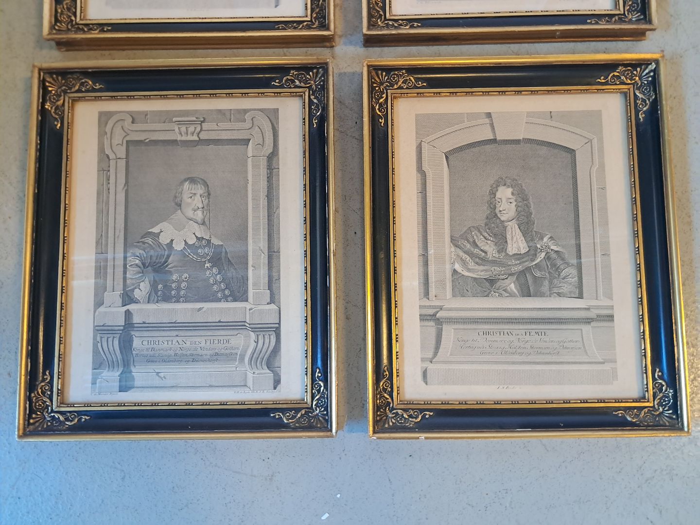 6 Billeder i guldmalet rammer af danske konger, fra 1920erne.