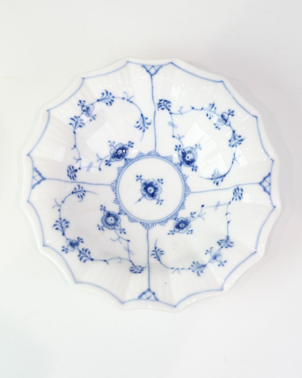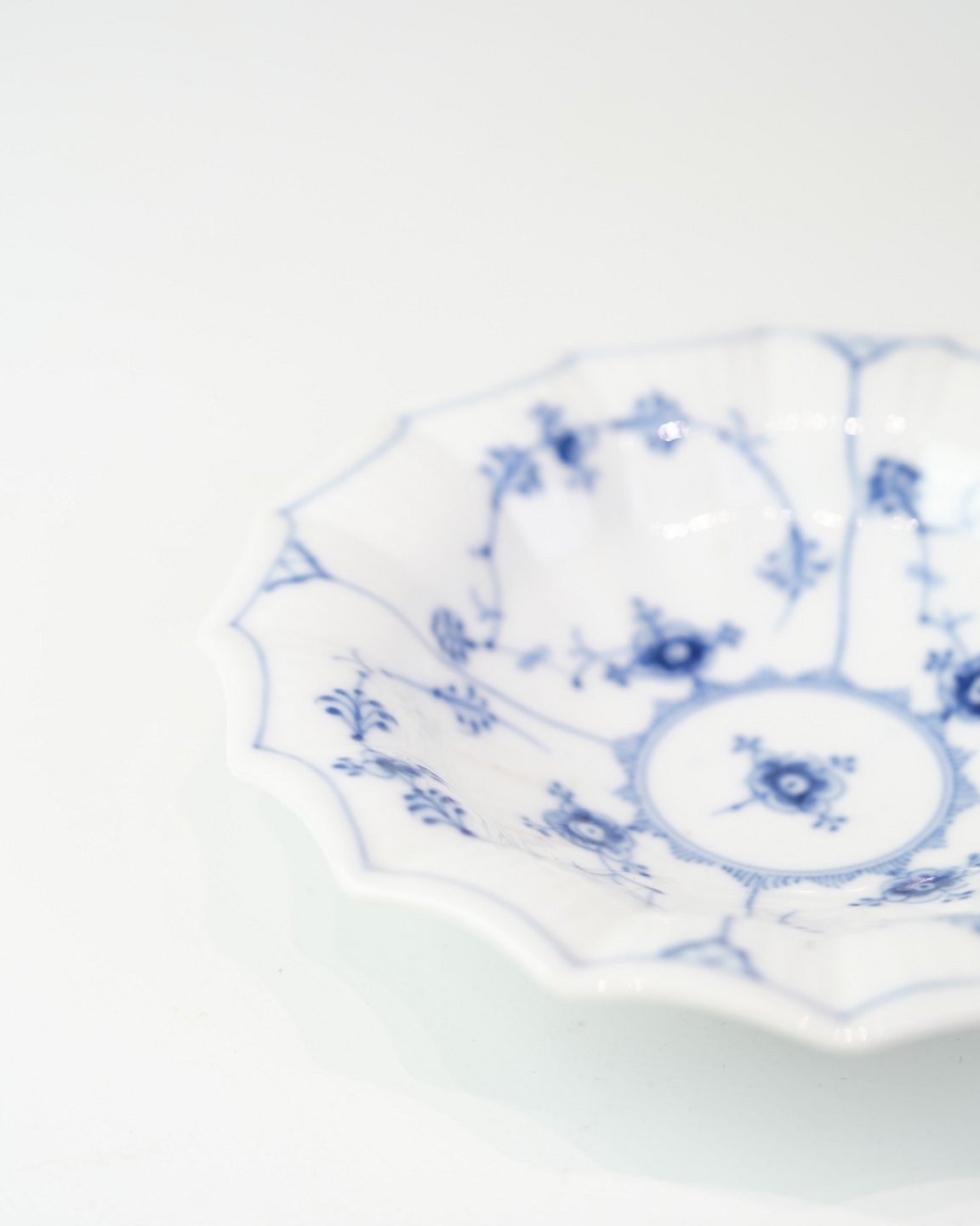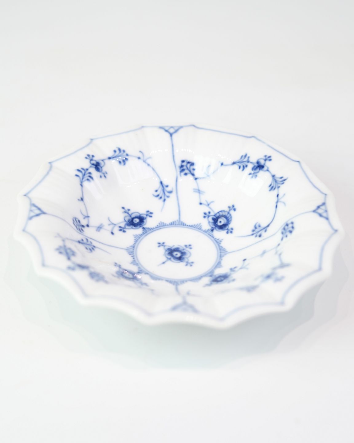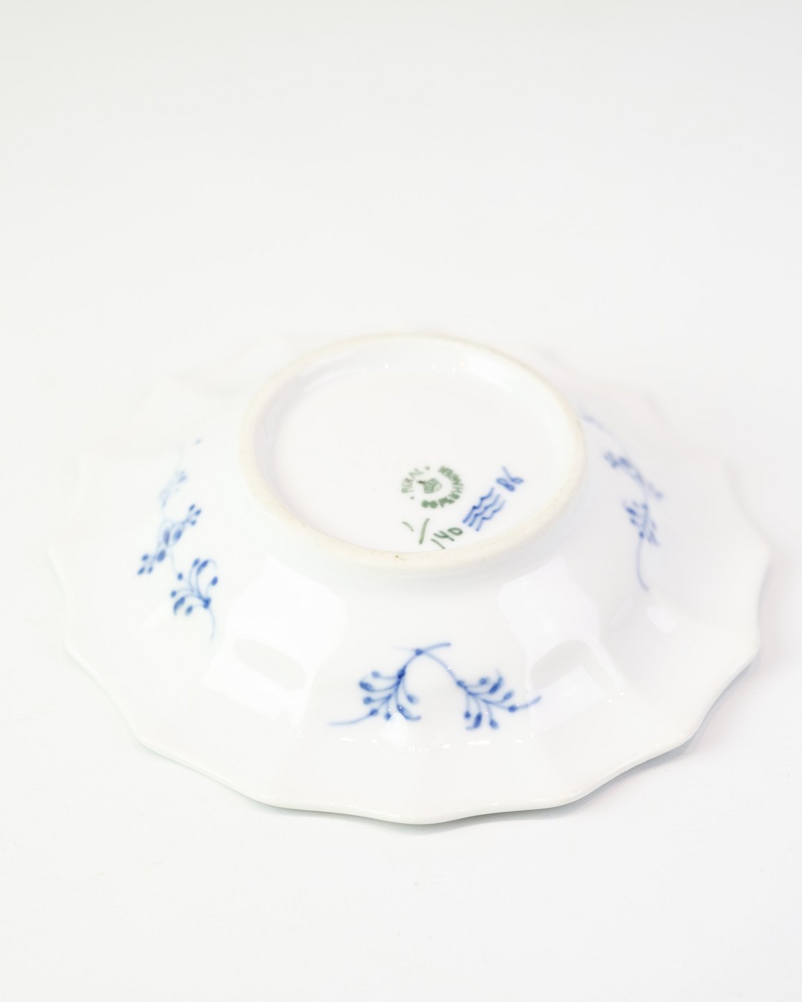 Bølgeskål fra Royal Copenhagen i det musselmalede mønster. Skålen har modelnummer 140/1 og en diameter på 15 cm. Udført i håndmalet porcelæn med klassisk blå dekoration.