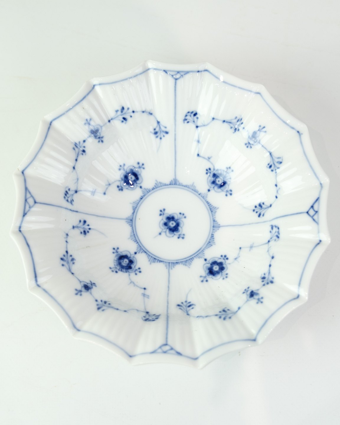 Asiet fra Royal Copenhagen i musselmalede mønster. Model No. 140 og er produceret i 1960. Udført i håndmalet porcelæn med den karakteristiske blå dekoration og riflet form, som kendetegner det klassiske stel.