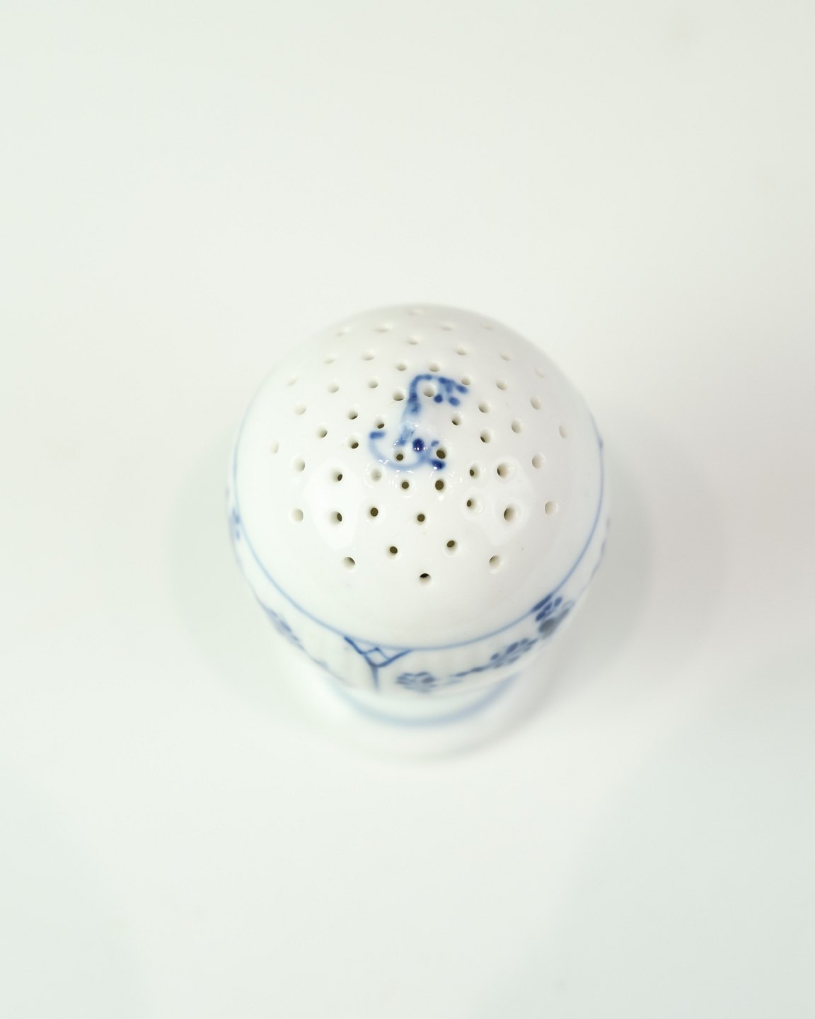 Peberbøsse fra Royal Copenhagen i det klassiske musselmalede mønster. Model No. 189 og er udført i håndmalet porcelæn med riflet overflade og blå dekoration.