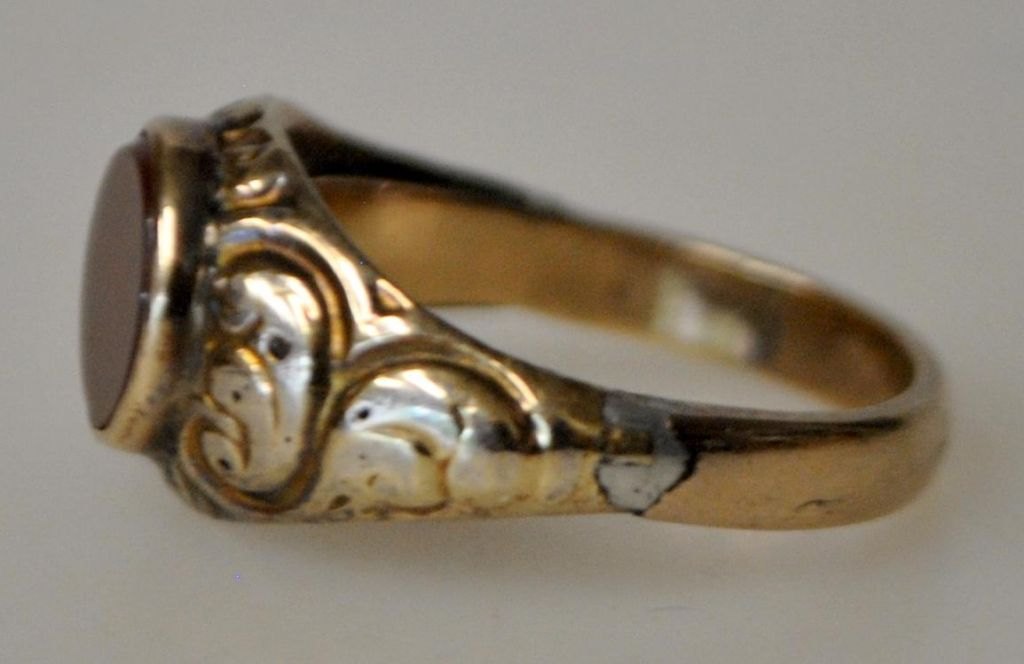 Antique 14 carat red gold ring with carnelian, 19th century. Unmarked. Size: 56/57. Weight: 4.4 grams.