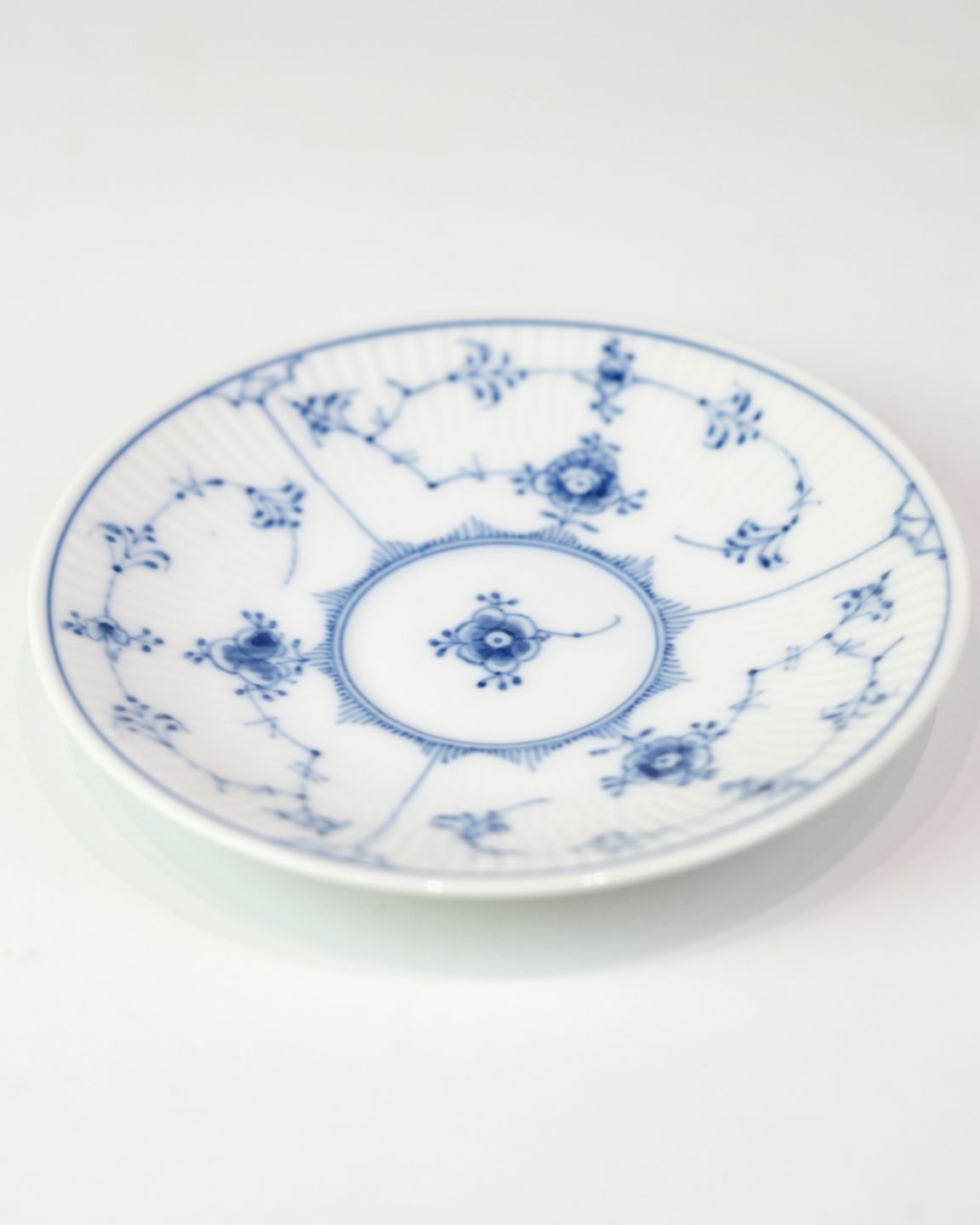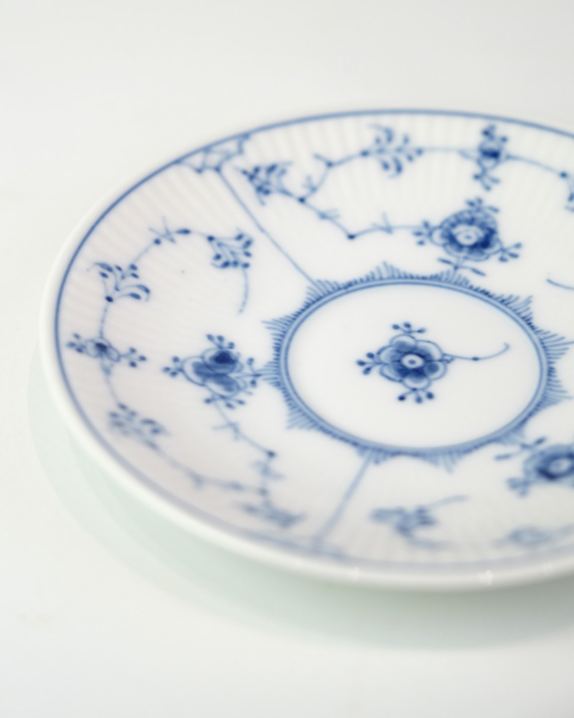 Håndmalet underkop fra Royal Copenhagens klassiske musselmalede riflet-serie. Modellen er No. 2162 og udført i porcelæn med den ikoniske koboltblå dekoration og den karakteristiske riflede overflade.