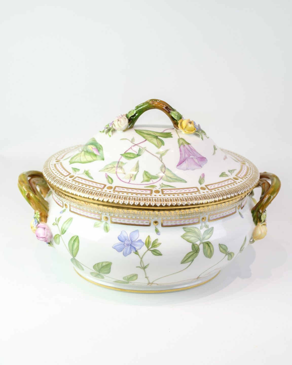 Tureen from Royal Copenhagen's Flora Danica series, made of porcelain and hand-painted with decoration no. 20/3559. The tureen is richly decorated with lifelike flowers and provided with a lid handle and two side handles designed as branch motifs with flowers and leaves in colors.