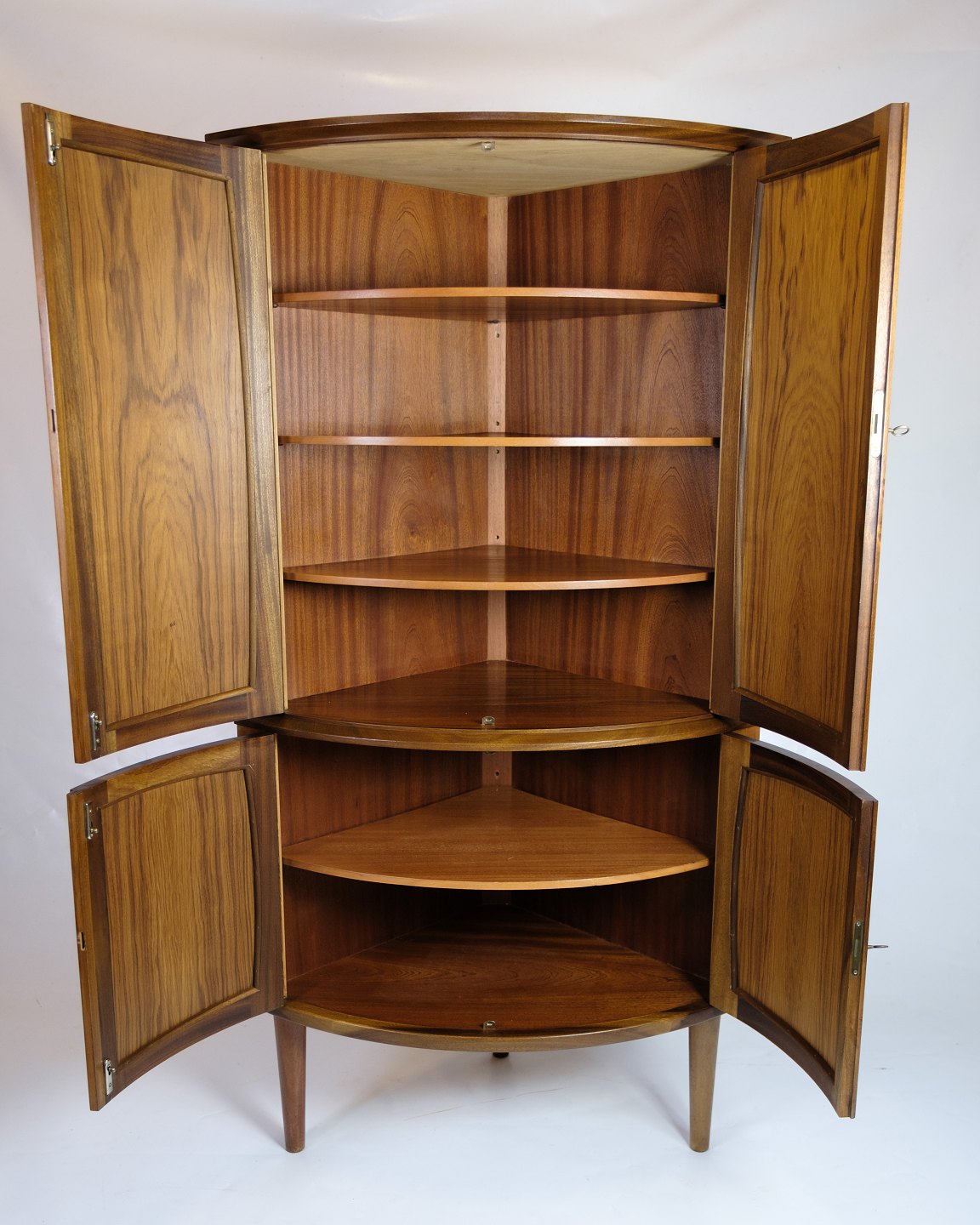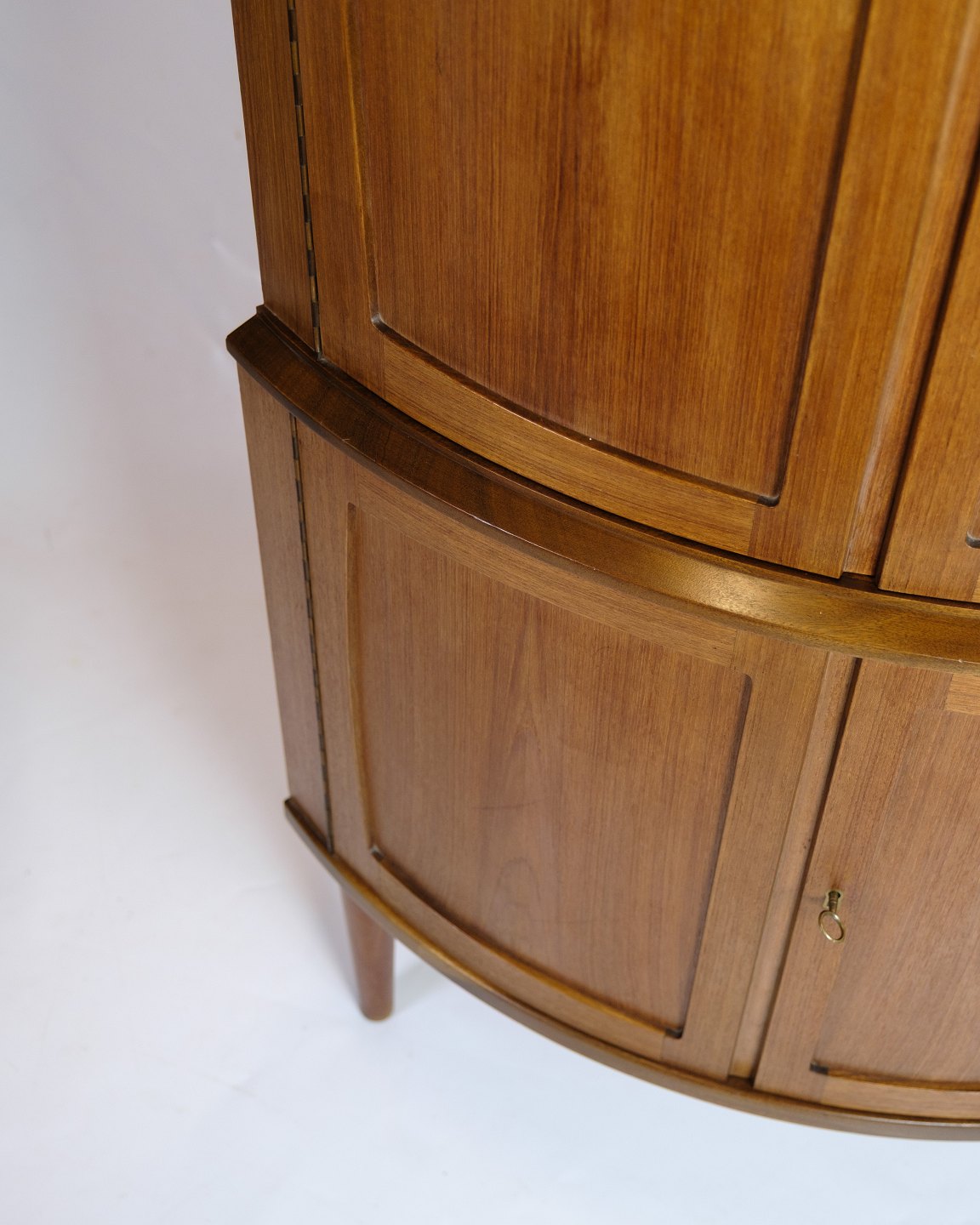 Corner cabinet in teak from the 1960s, manufactured by Petersons Midtjydske Møbelfabrik. The cabinet is designed with double filling doors at the top and bottom, which provide access to spacious storage sections.
