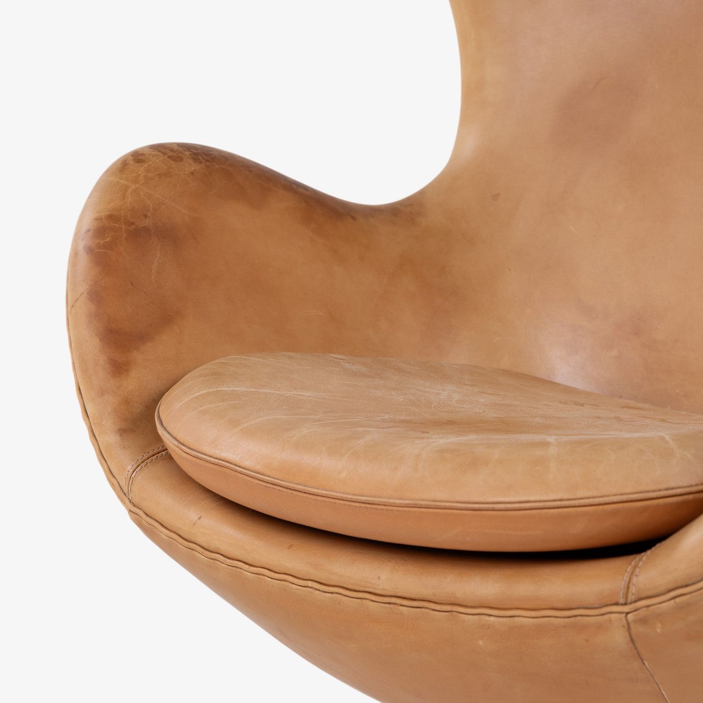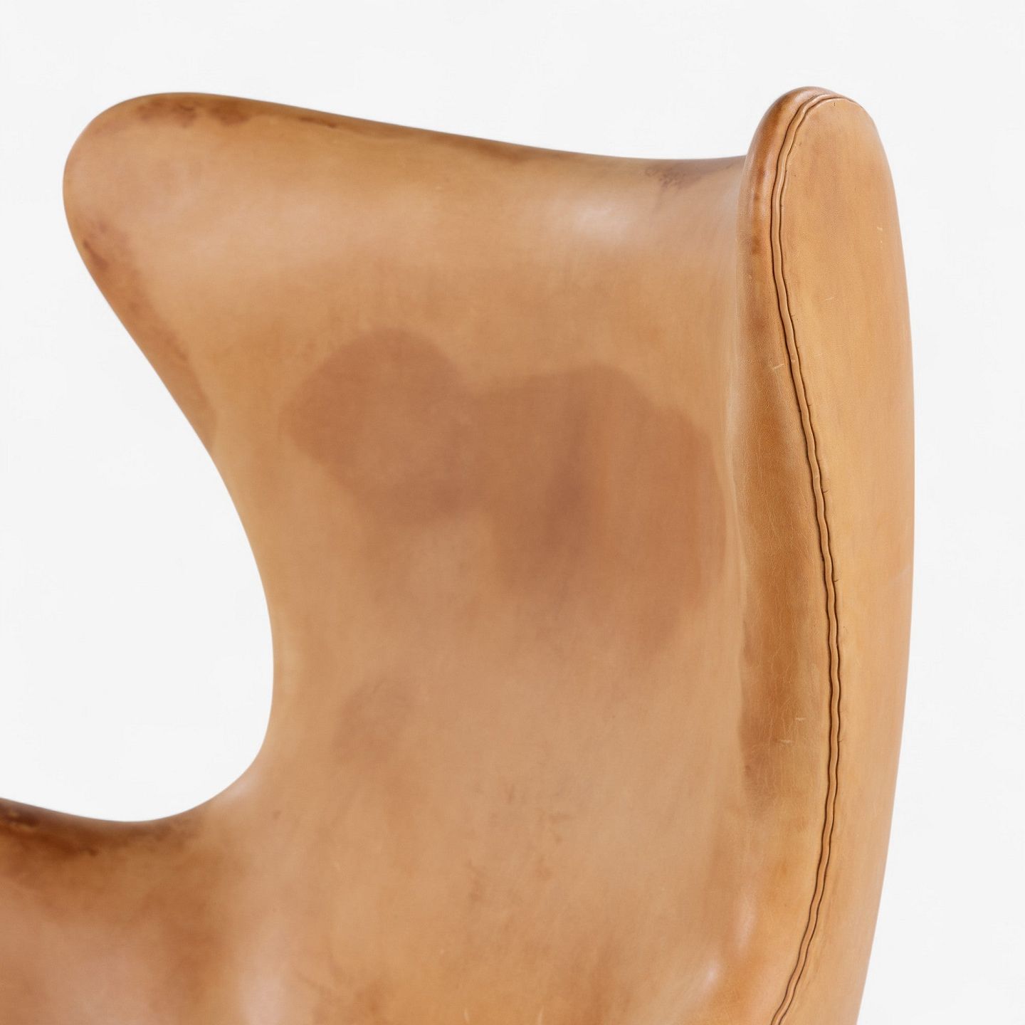 AJ 3316 - 'Ægget'-lænestol i patineret naturskind på aluminiumsfod. Ægget (1958) blev tegnet til SAS Royal Hotel i København sammen med Svanen og Gryden. Stolen er i dag et designikon.