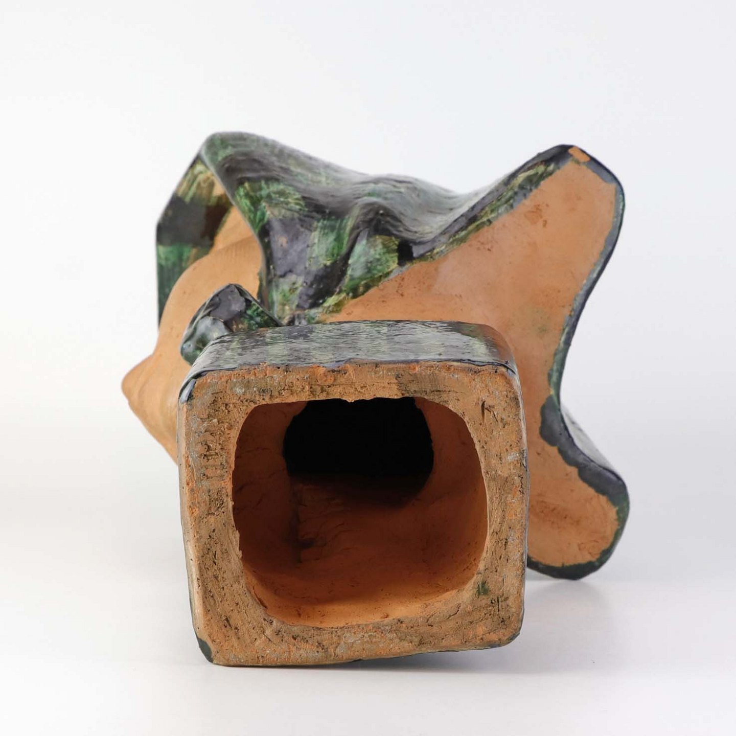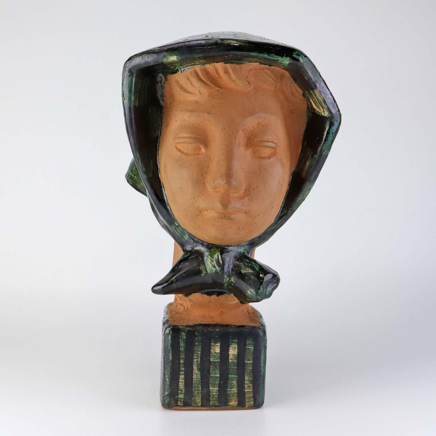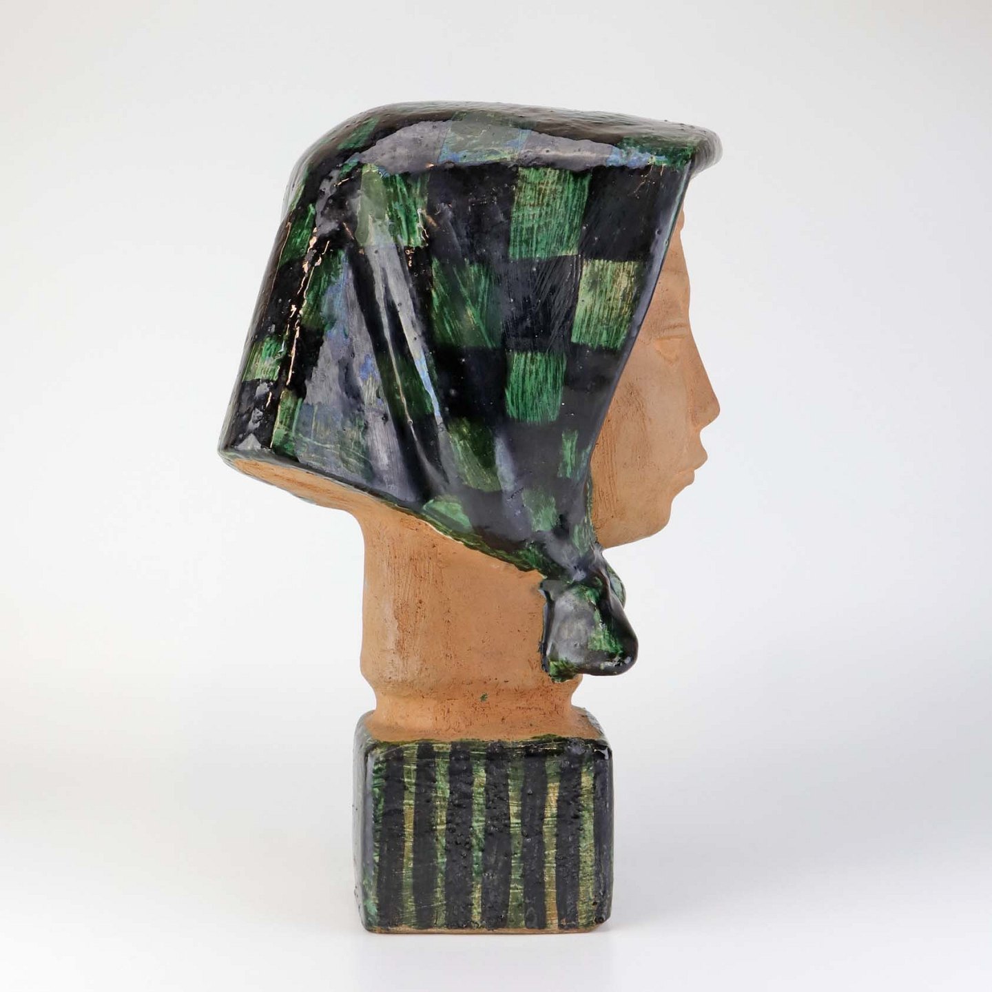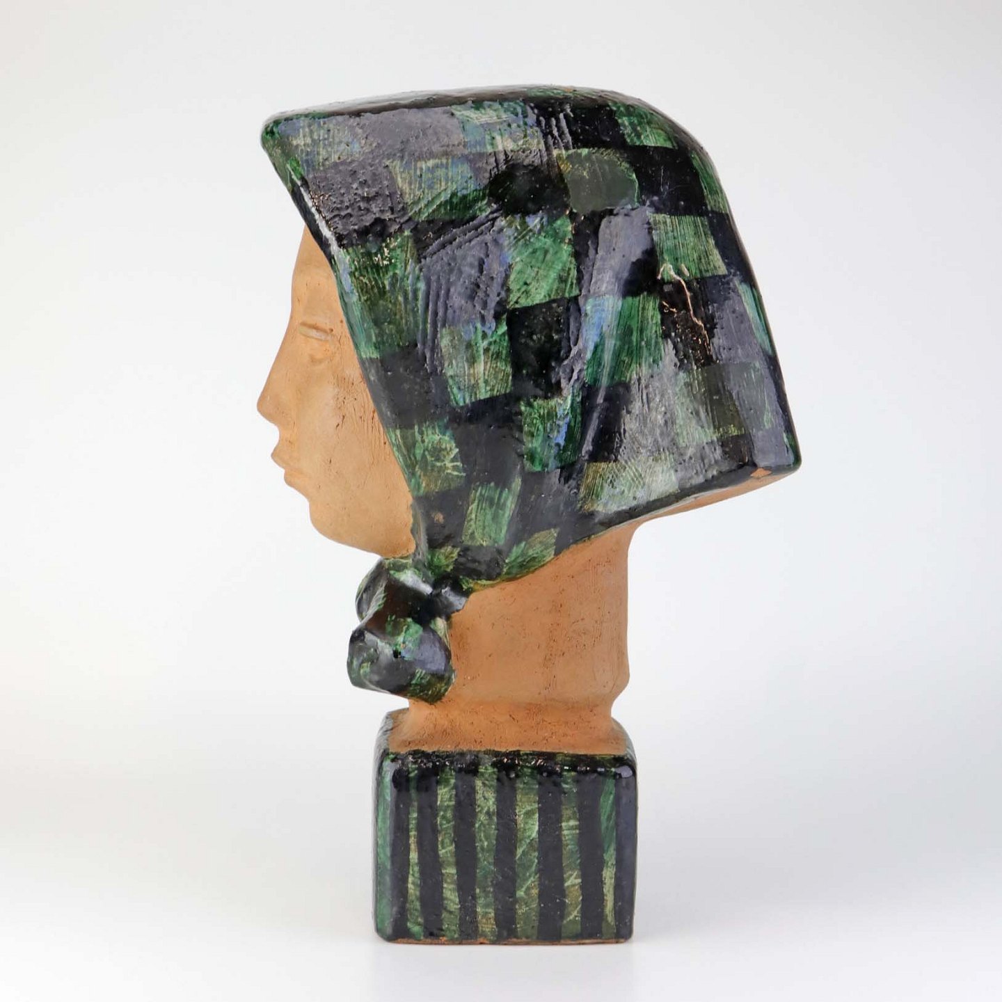Figur i delvist glaseret keramik med motiv af kvinde med hovedtørklæde dekoreret med sorte og grønne tern.