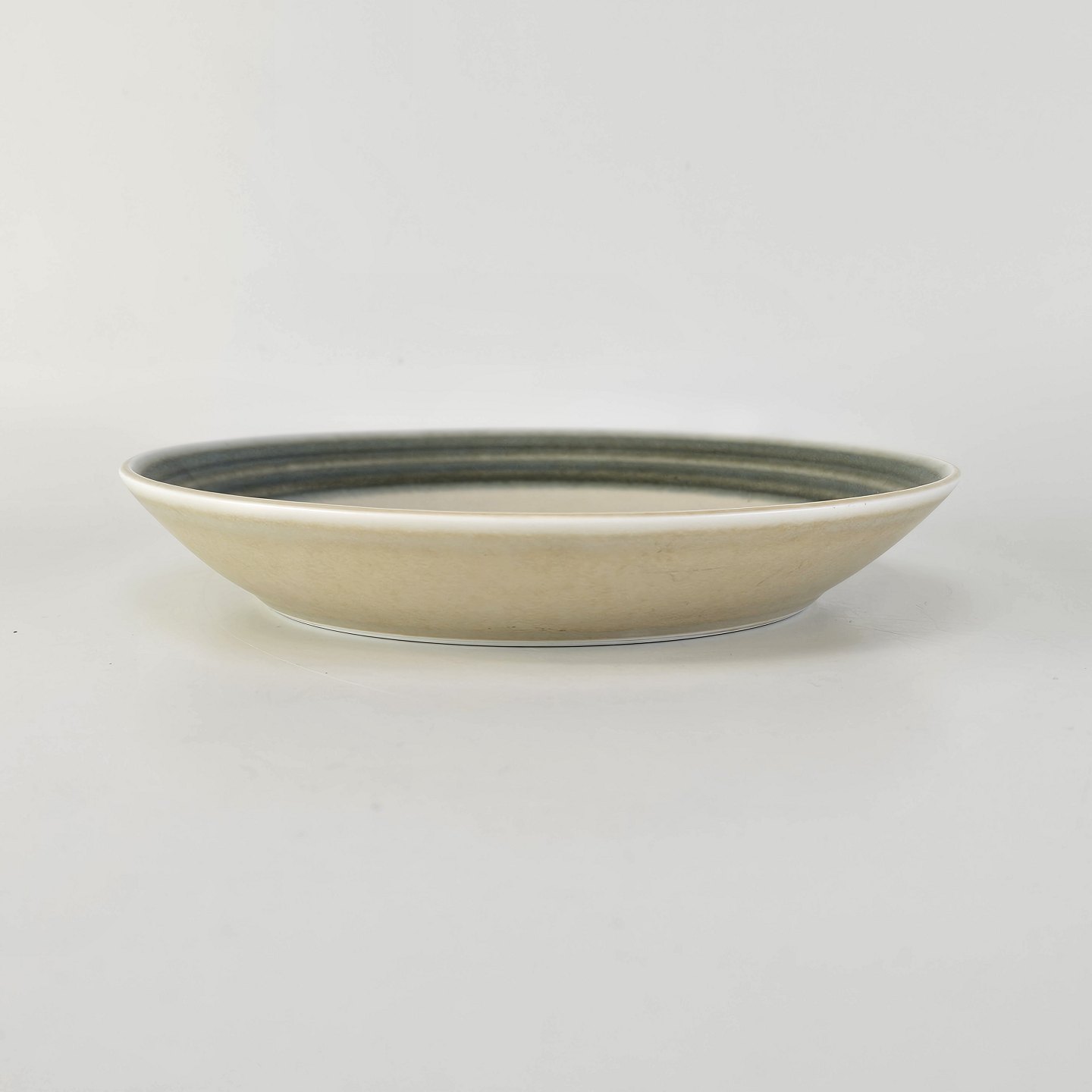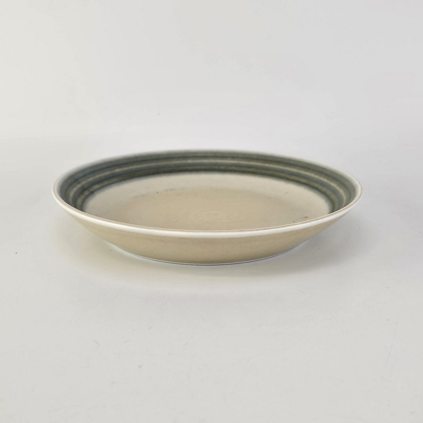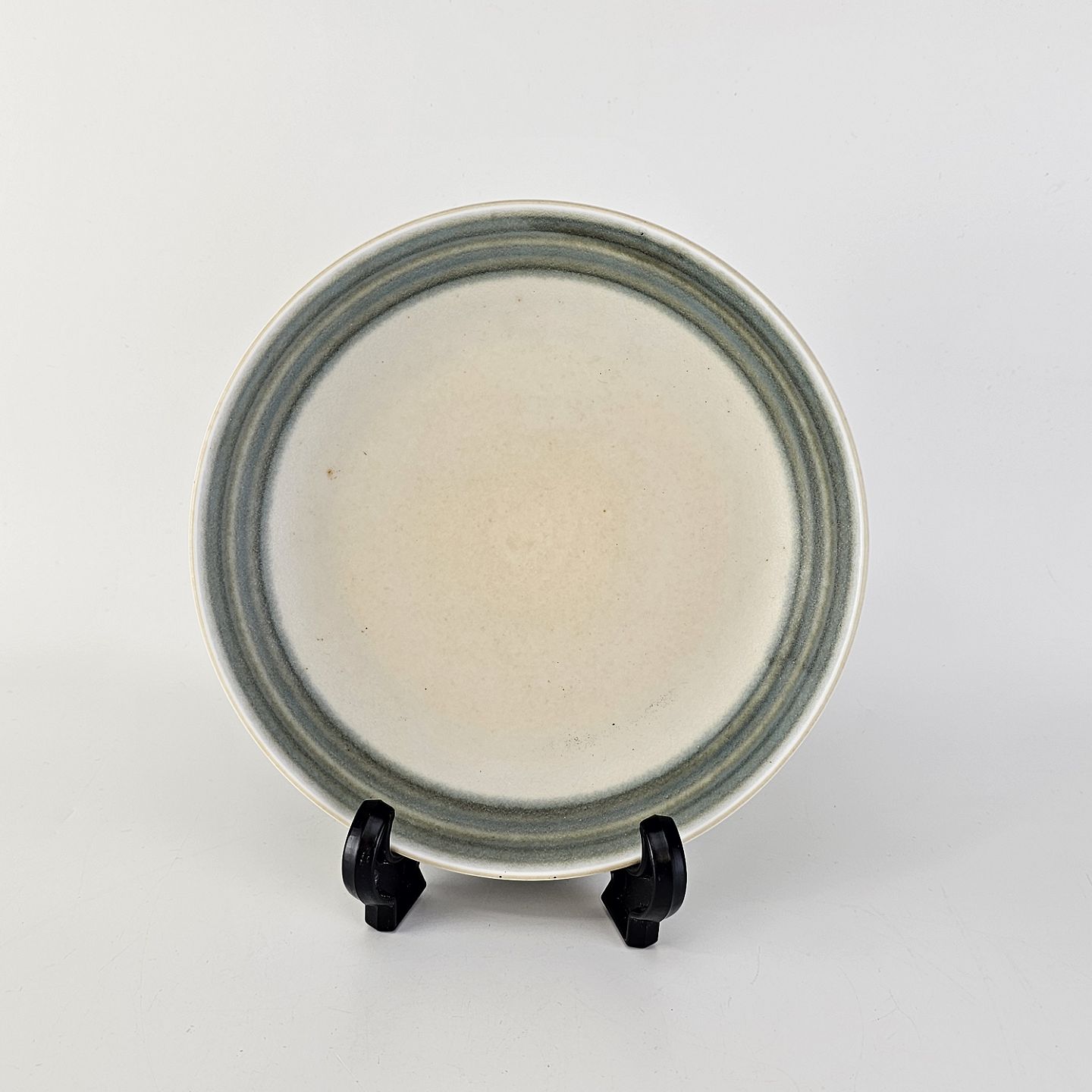 Dessert tallerken i stentøj fra stellet Edith Sonne, mat hvid dekoreret med en blå stribe