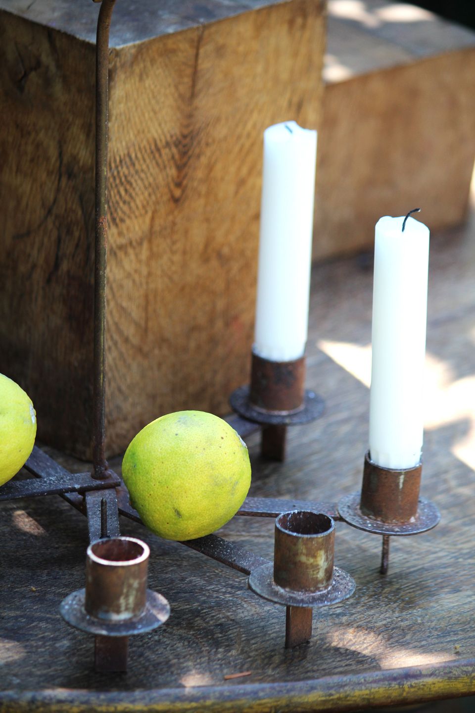 The candlestick has some small skewers where small apples