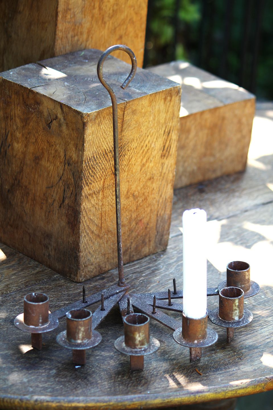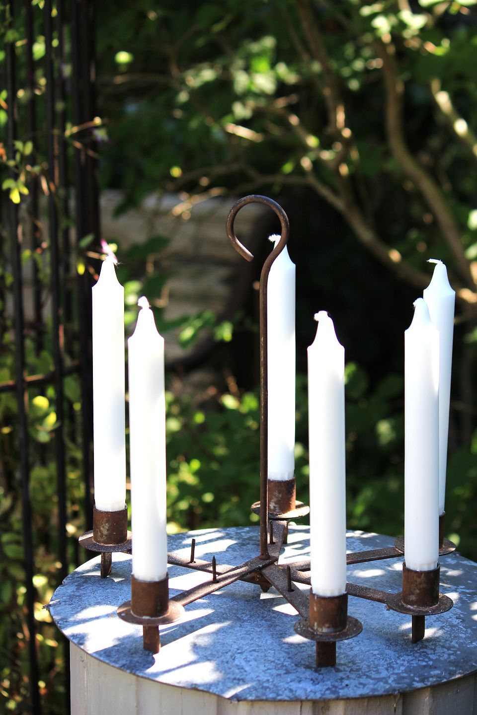 Old swedish wrought iron candlestick for 6 candles that can either stand on a table or be hung from the ceiling.