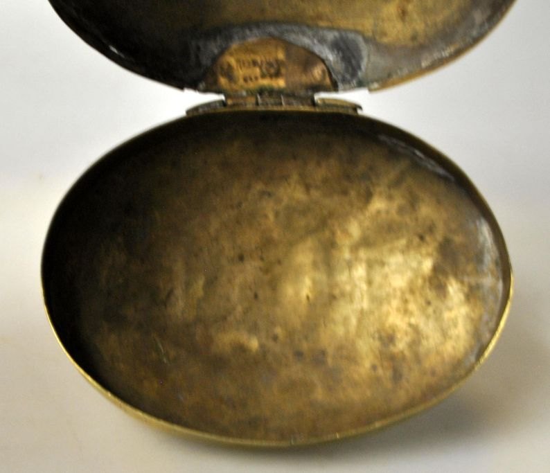 Hollandsk tobaksæske i messing, 1749. Med dekorationer i form af to kvinder og landskab med kirke. Oval med låg. Repareret. Med ejerinitialer og årstal.: 1749. L.: 11 cm.