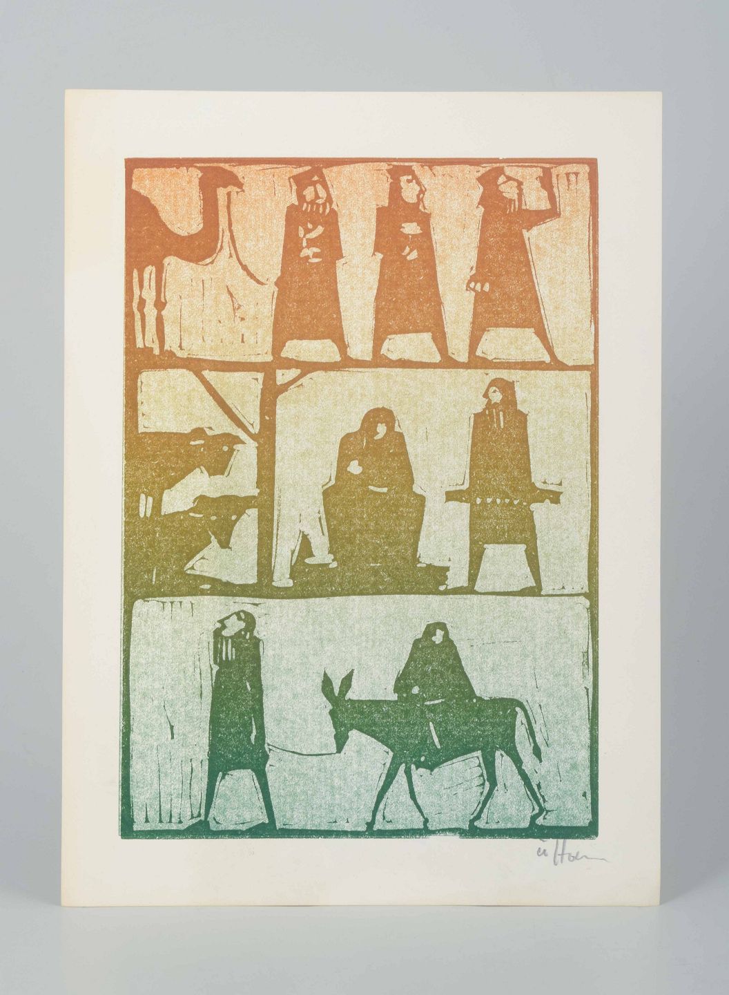 Et stemningsfuldt træsnit af Åke Holm, hvor religiøse motiver gengives i en monumental og stiliseret form, forstærket af den farverige trykteknik.