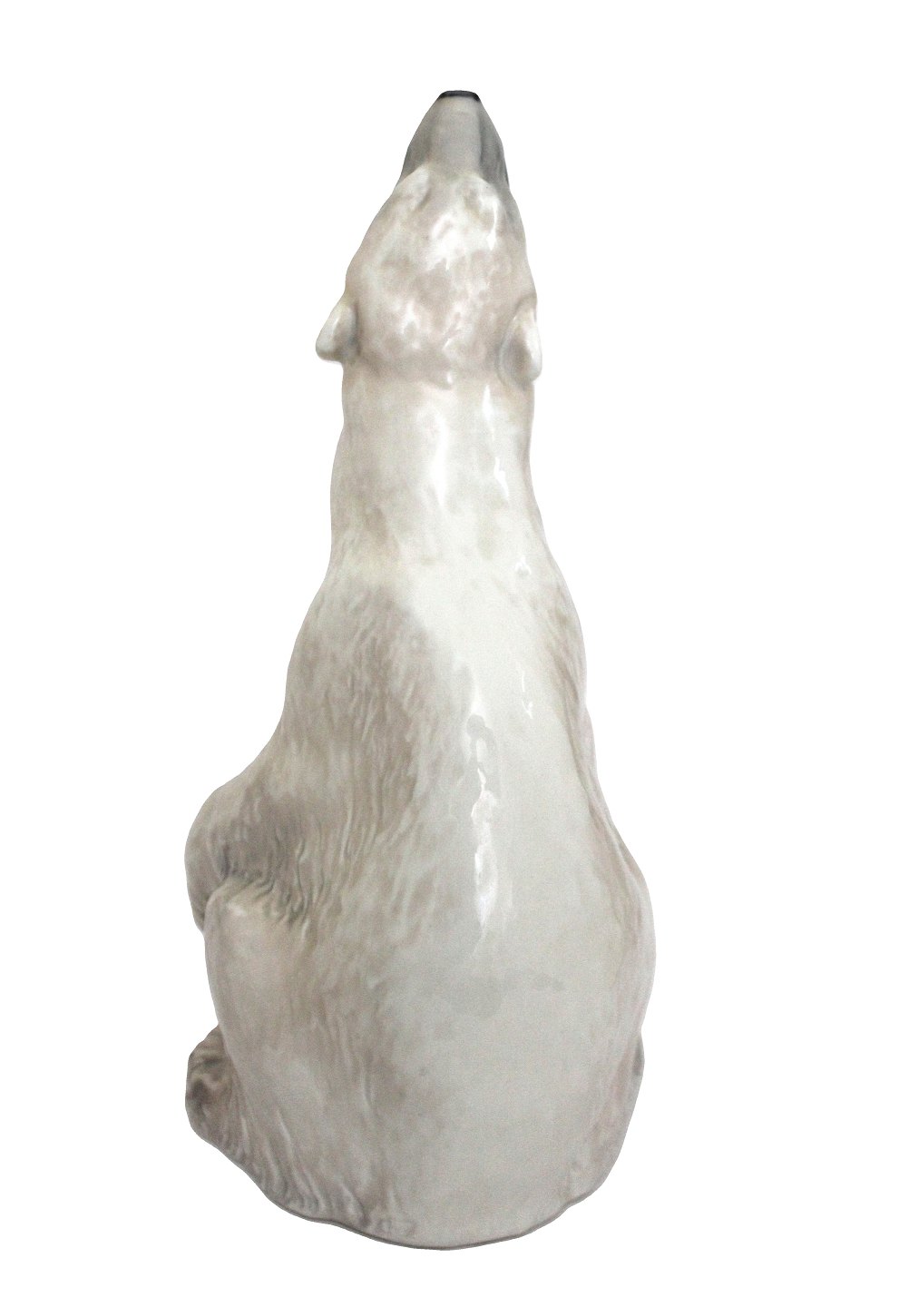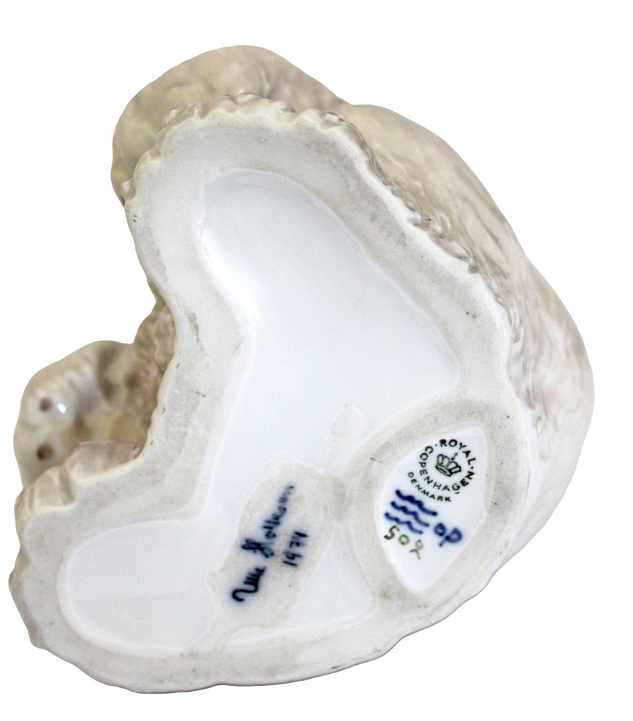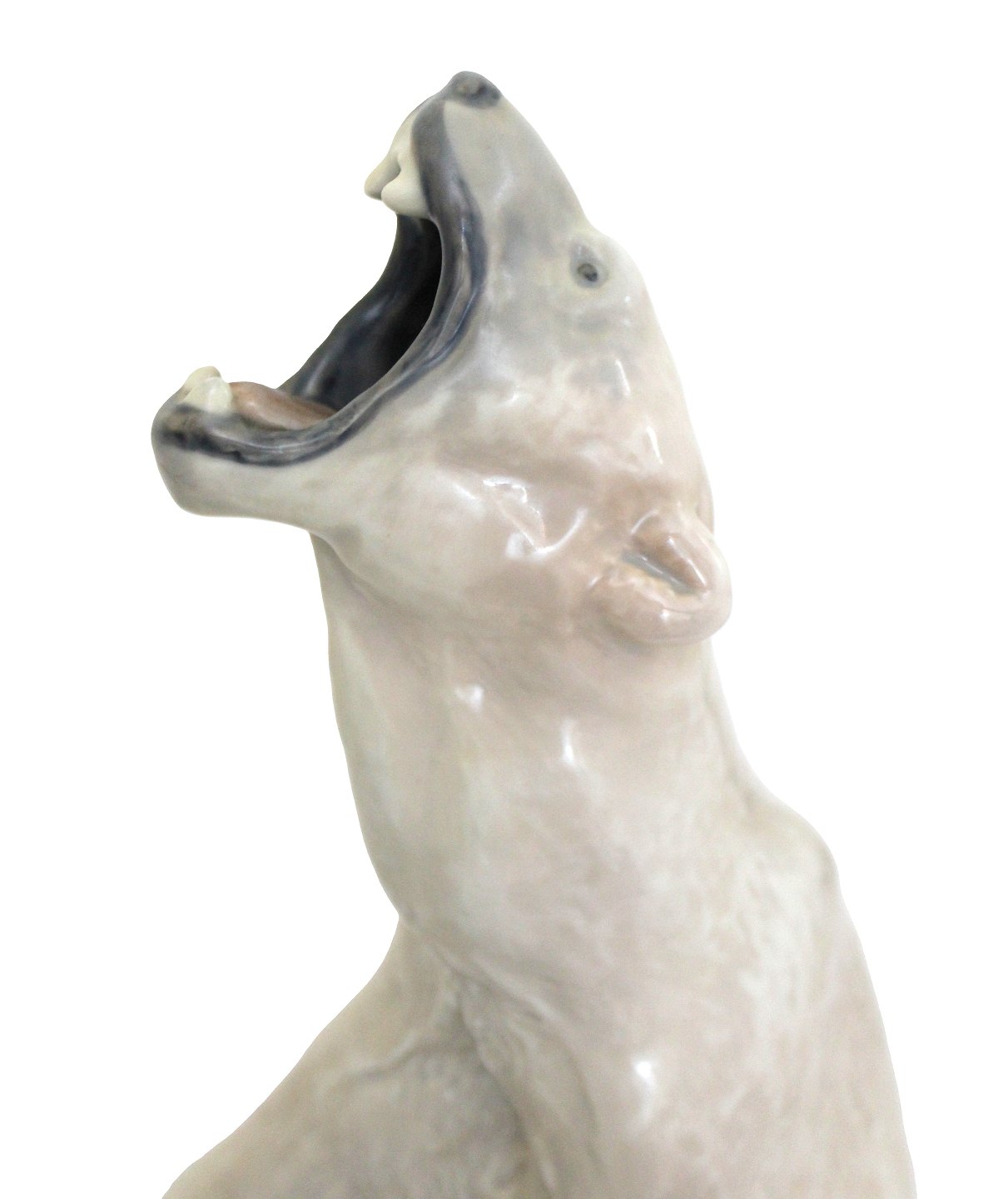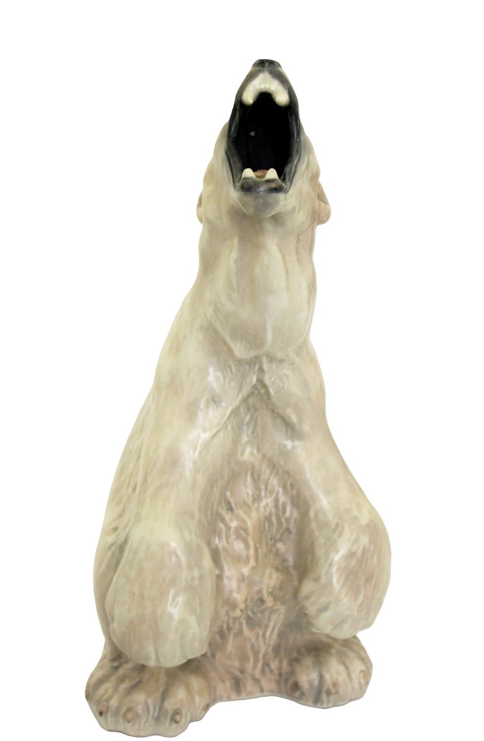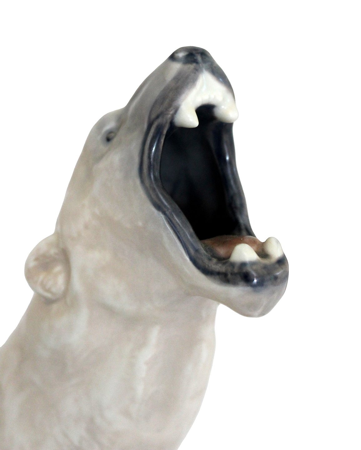 Royal Copenhagen, Stor siddende isbjørn der brøler. Nr. 502. Proveniens: Malerindens navn står i bunden, hun fik den som gave af Royal Copenhagen i 1974. Højde 32,5 cm. Bredde 15 cm. Dybde 12 cm. I. sortering. Flot stand. Pris: 2100 kr.