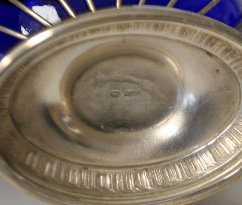 WMF sugar bowl, approx. 1900. Germany. Silver-plated silver with cobalt blue glass insert. Empire style. H.: 15 cm. L.: 23 cm. Stamped.