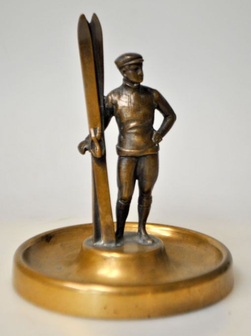 German artist (20th century): A skier with his skis. Bronze figure. Unsigned. The figure stands on a round bronze bowl. H.: 15 cm. Dia. foot: 12.5 cm.